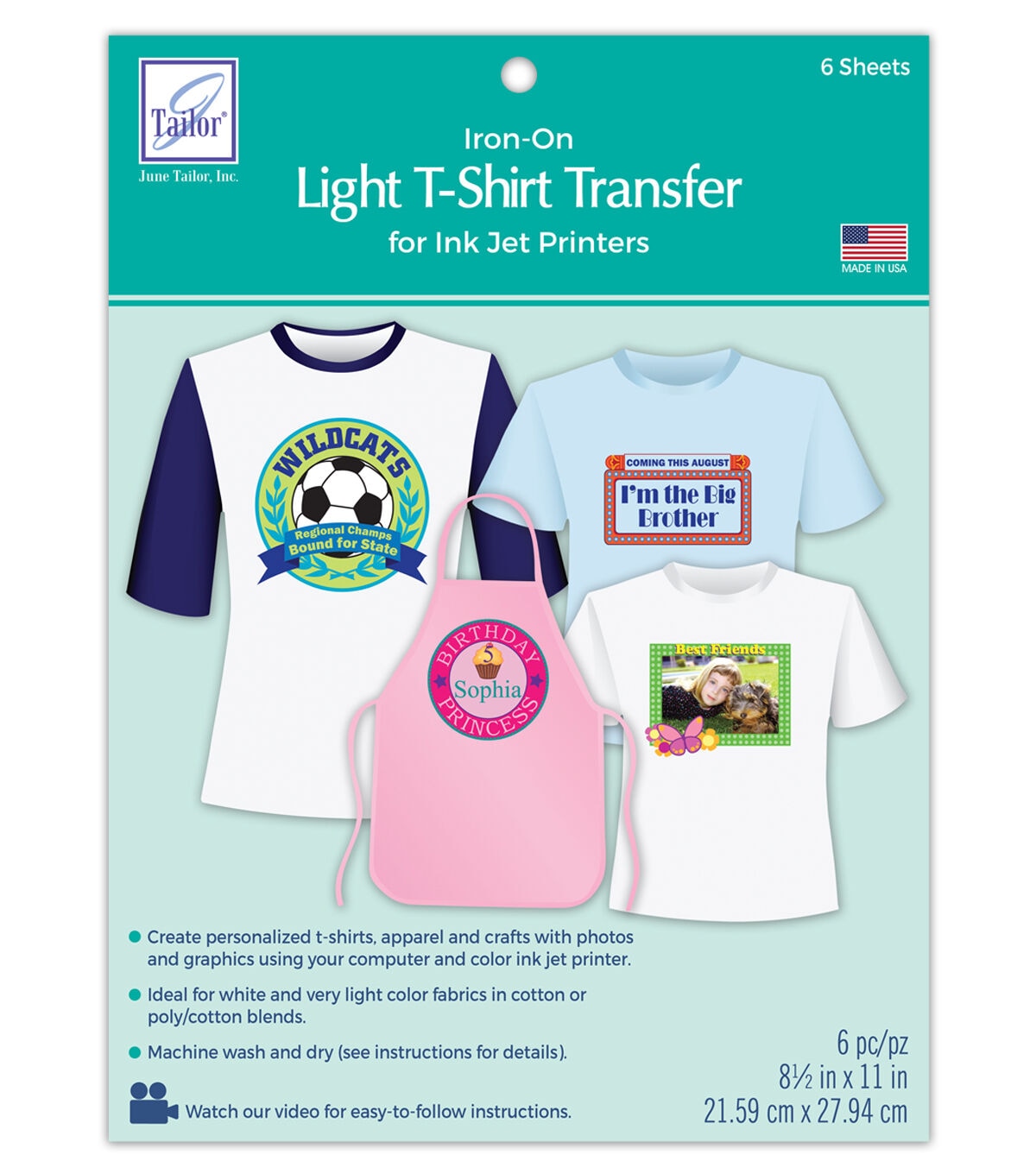 The June Tailor Iron-on Light T-shirt Inkjet Transfer Sheets are great for personalizing gifts for friends and family. Create images using photographs, graphics or text on a computer and print them on these transfer sheets using a home inkjet printer. You can then transfer the images from the sheets onto the fabric of your choice. Once complete, the projects are machine washable. These sheets are designed specifically for use on white or very light-colored 100% cotton fabric.