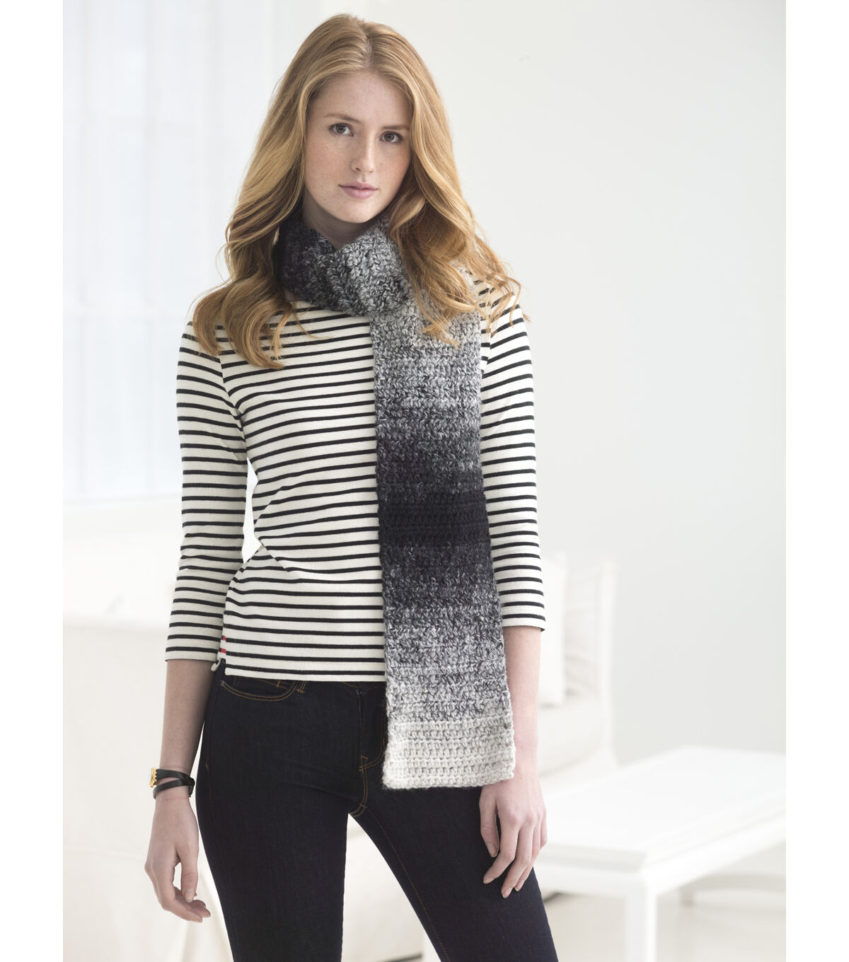 The Lion Brand Scarfie Yarn is a soft and lofty acrylic wool blend yarn with enough yardage per ball to knit or crochet a full length scarf. Once worked, you see a unique self-striping ombre effect appear, with gradual shading from one color to the next. The ombre pattern is a sophisticated and tonal blend of solid and heathered hues. Use them to create stylish garments, accessories and afghans.