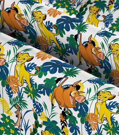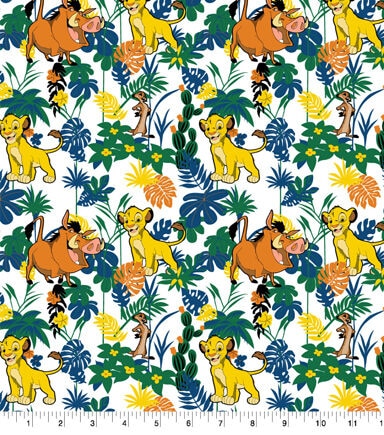 This Lion King Simba Adventure Knit fabric is covered with Timon, Pumbaa, and Simba. There are bright trees, leaves and flowers all around the characters. This fabric would be perfect for anyone who likes the Lion King or animals. This fabric Is 96 % Cotton and 4 % Spandex and machine washable.