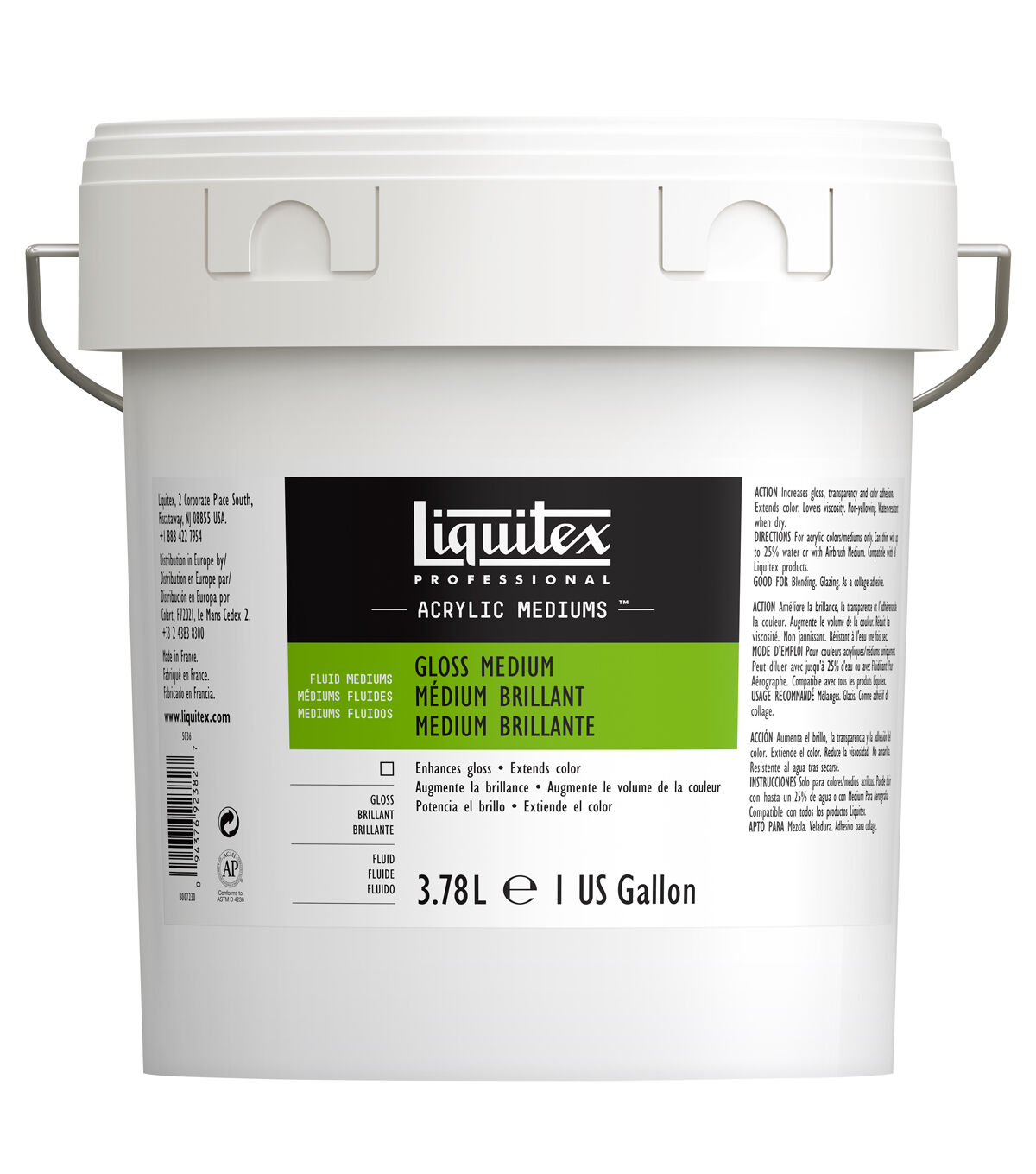 The Liquitex Gloss Medium & Varnish enhances the depth of color and increases transparency, gloss and flow. It dries clear and glossy, and is also permanent, non-yellowing, flexible and water-resistant when dry. This package contains 1 gallon of gloss acrylic medium and varnish.