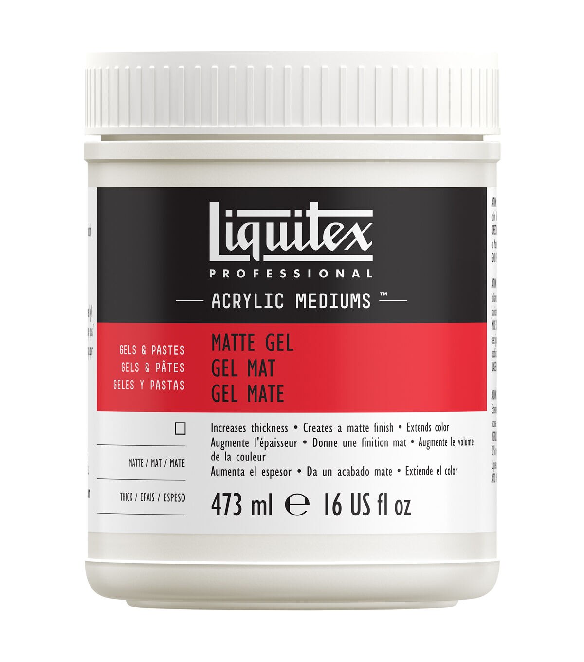 The Liquitex Matte Acrylic Gel Medium is a heavy body, translucent gel that creates a matte, non-reflective finish, and slows drying time and extends paint volume. It retains brush strokes and dries transparent, and is permanent, non-yellowing, flexible and water-resistant when dry. This gel medium also serves as an excellent glue for collage projects. Mix it with acrylic color or thin with up to 25% water. The package contains 16 ounces of matte gel.