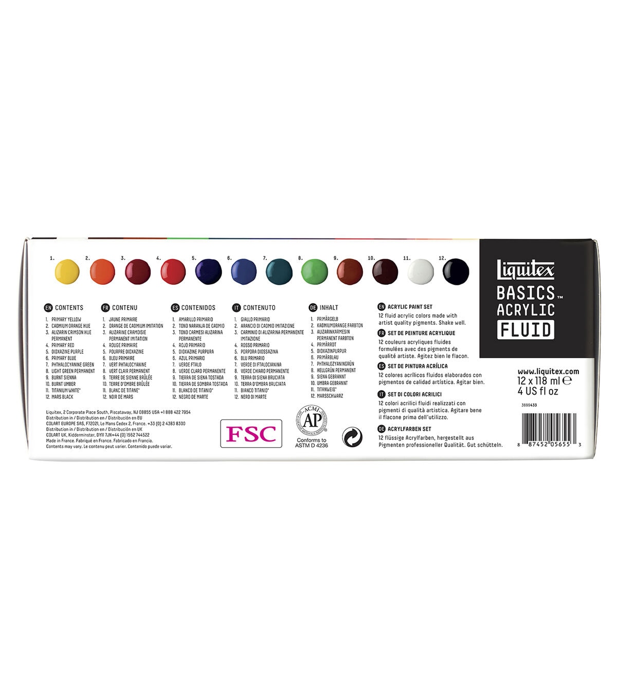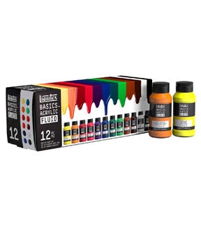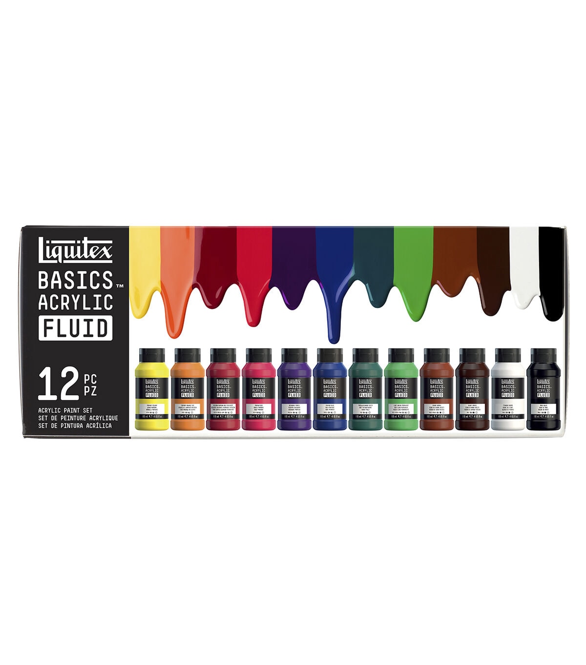 Liquitex Basics Acrylic Fluid is the everyday acrylic color with a fluid, flowing consistency straight from the bottle. These vibrant colors are made with the same high-quality artist pigments as Liquitex Basics Acrylic Color. Maximum versatility, now with superb flowing application. All with a permanent, water-resistant finish when dry. This versatile, fluid viscosity paint can be poured, used to cover large areas, create fine detail work and much more. AP Certified, ideal for studio and educational use. This set includes 1 each of the following colors: Primary Yellow, Cadmium Orange Hue, Alizarin Crimson Hue Permanent, Primary Red, Dioxazine Purple, Primary Blue, Phthalocyanine Green, Light Green Permanent, Burnt Sienna, Burnt Umber, Titanium White, Mars Black.