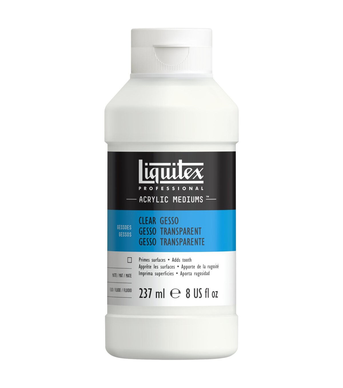 Liquitex-Clear Gesso. A very clear size and ground that keeps the working surface visible. Clear Gesso provides an ideal degree of tooth for pastel, oil pastel, graphite, and charcoal as well as an excellent ground for acrylic and oil paints. This gesso is ideal for painting over colored or patterned surfaces. This package contains 8 ounces of Clear Gesso. Conforms to ASTM D4236. Imported.