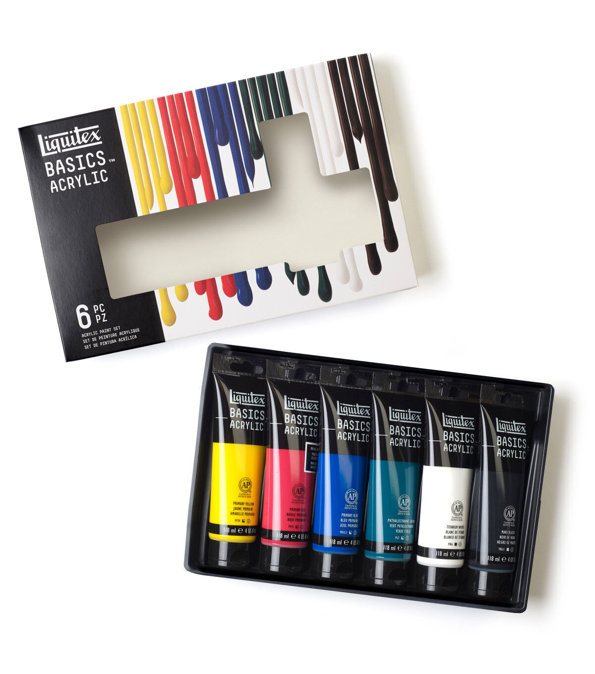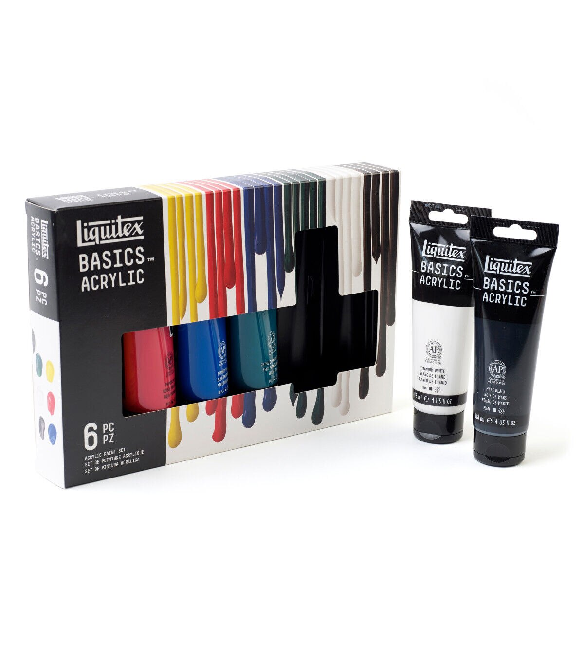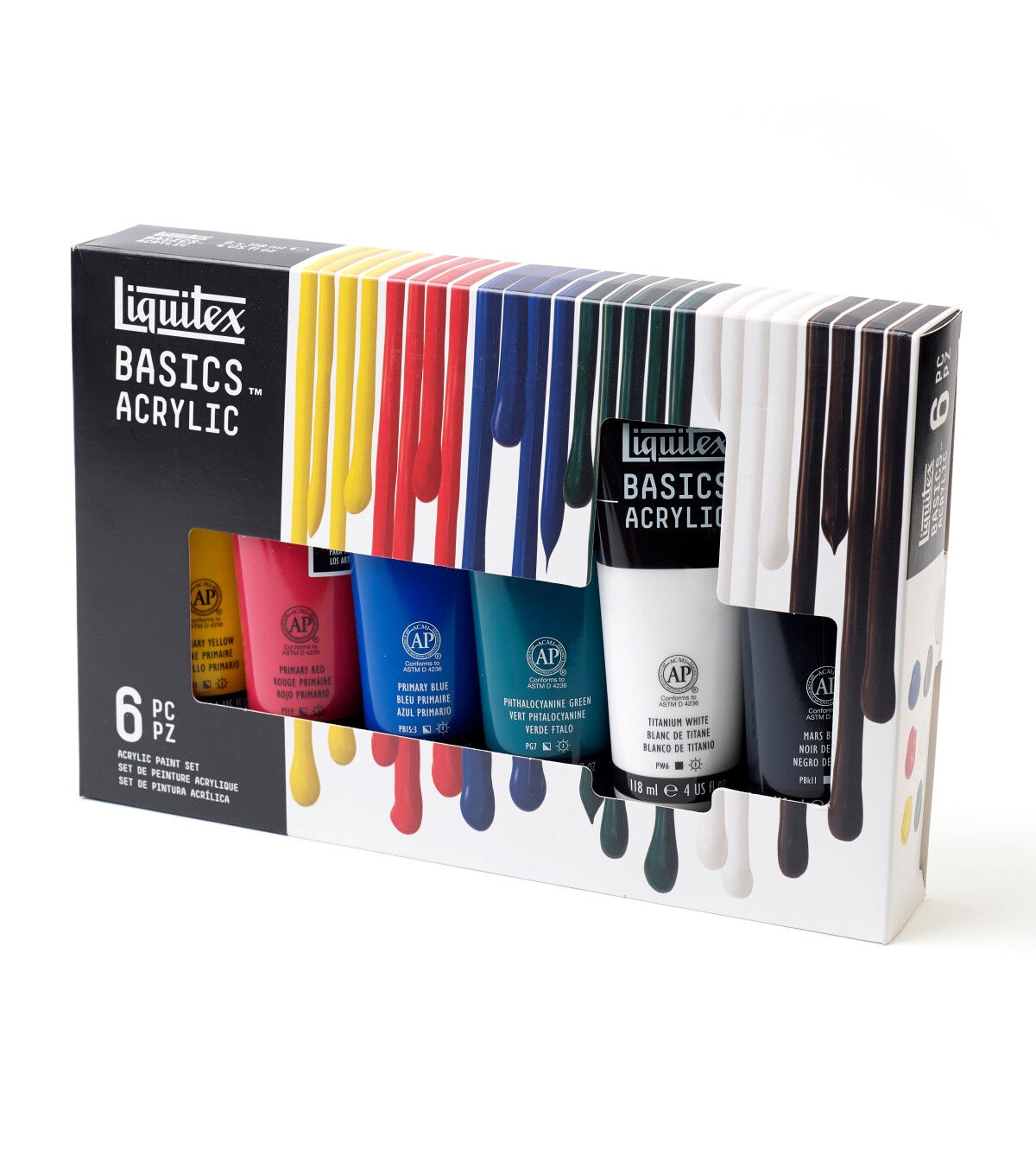 Liquitex Basics acrylics is for all creatives. It gives an artist the perfect balance of quality and economy. Formulated with Liquitex standards with lightfast, artist quality pigments. Use Basics on their own or combine with Liquitex professional materials- if made by Liquitex, they are all intermixable. Great for sketching and underpainting. Can be used on all surfaces: canvas, paper & board, wood, metal, styrofoam, stone, ceramics and textiles. Set includes 6 118ml (4 oz) colors: Titanium White, Primary Yellow, Primary Red, Phthalo Green, Primary Blue and Mars Black.
