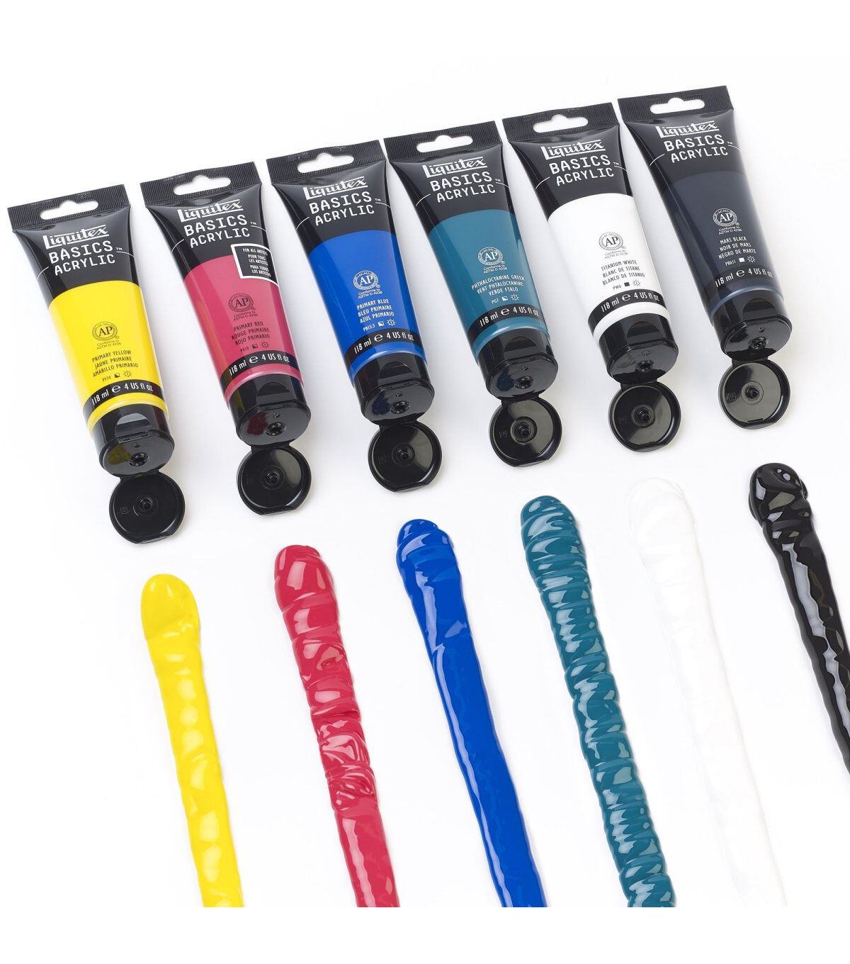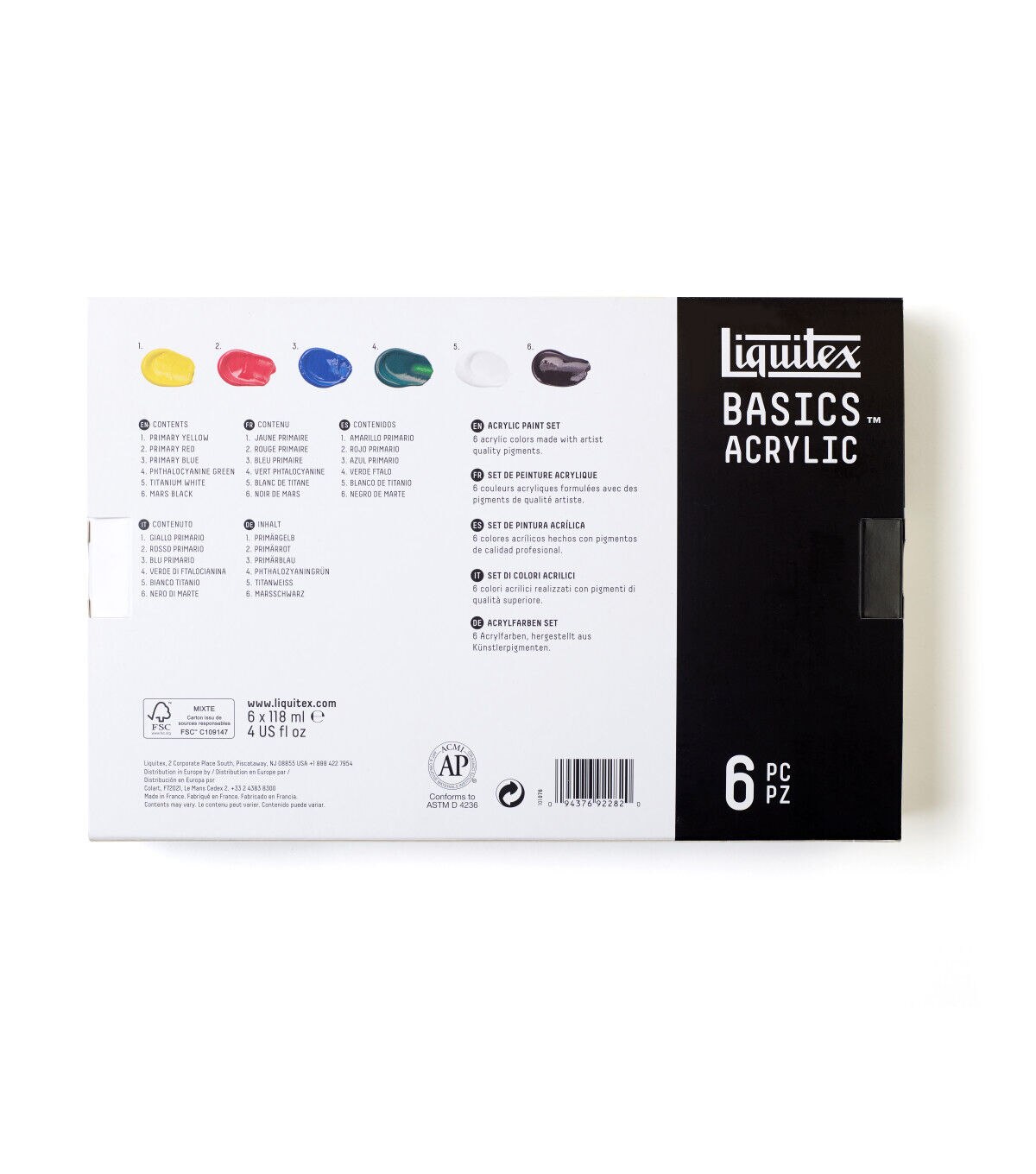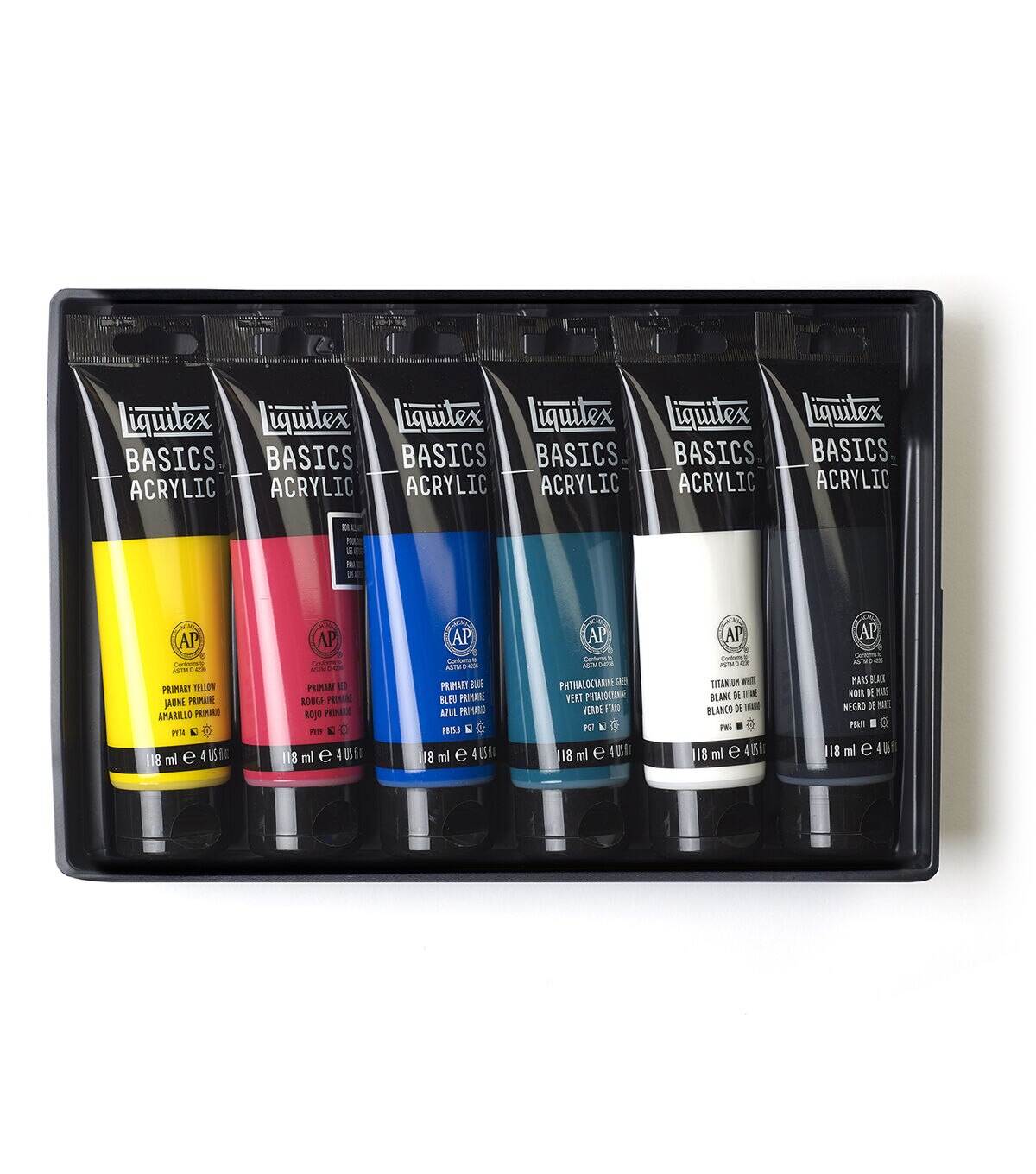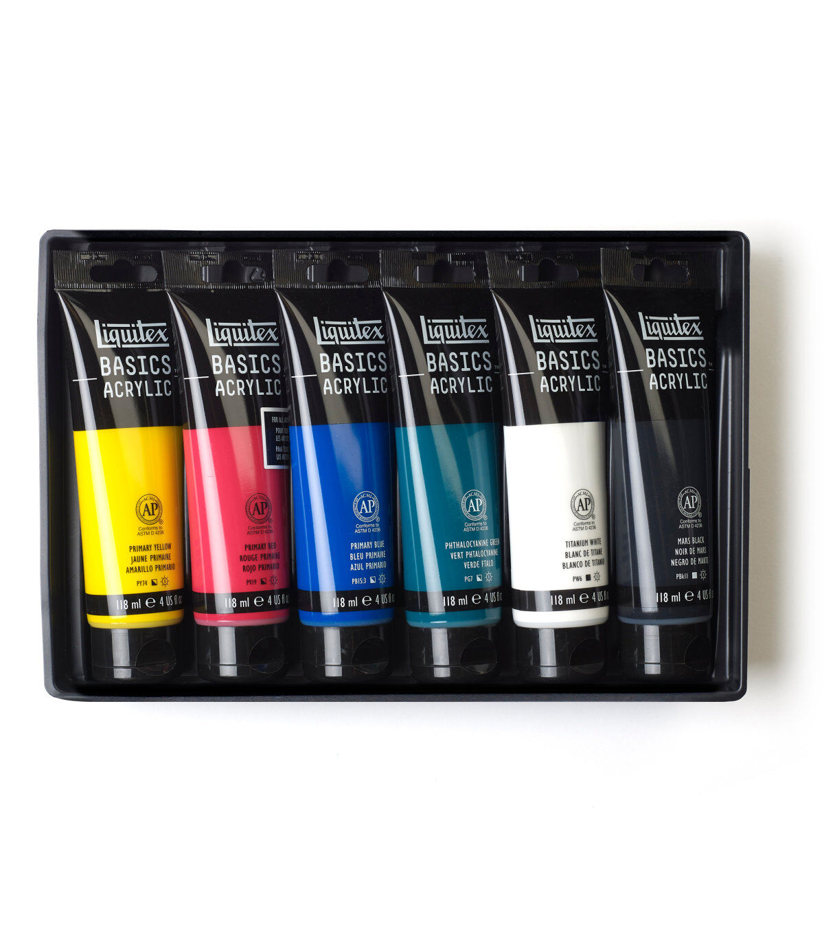 Liquitex Basics acrylics is for all creatives. It gives an artist the perfect balance of quality and economy. Formulated with Liquitex standards with lightfast, artist quality pigments. Use Basics on their own or combine with Liquitex professional materials- if made by Liquitex, they are all intermixable. Great for sketching and underpainting. Can be used on all surfaces: canvas, paper & board, wood, metal, styrofoam, stone, ceramics and textiles. Set includes 6 118ml (4 oz) colors: Titanium White, Primary Yellow, Primary Red, Phthalo Green, Primary Blue and Mars Black.