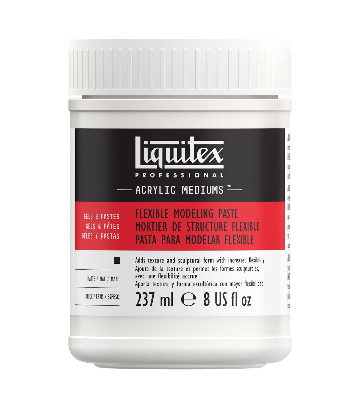 This thick, matte, opaque gel painting medium allows you to create dramatic dimension and texture—blurring the line between painting and sculpture. It dries more slowly than other modeling pastes; it is workable while wet and results in a hard yet flexible surface. Use a palette knife, trowel, paintbrush, cake decorating tips and more to create a variety of effects. When mixed with acrylic colors, this paste will act as a weak tinting white while increasing the thickness and rigidity of the paint.
