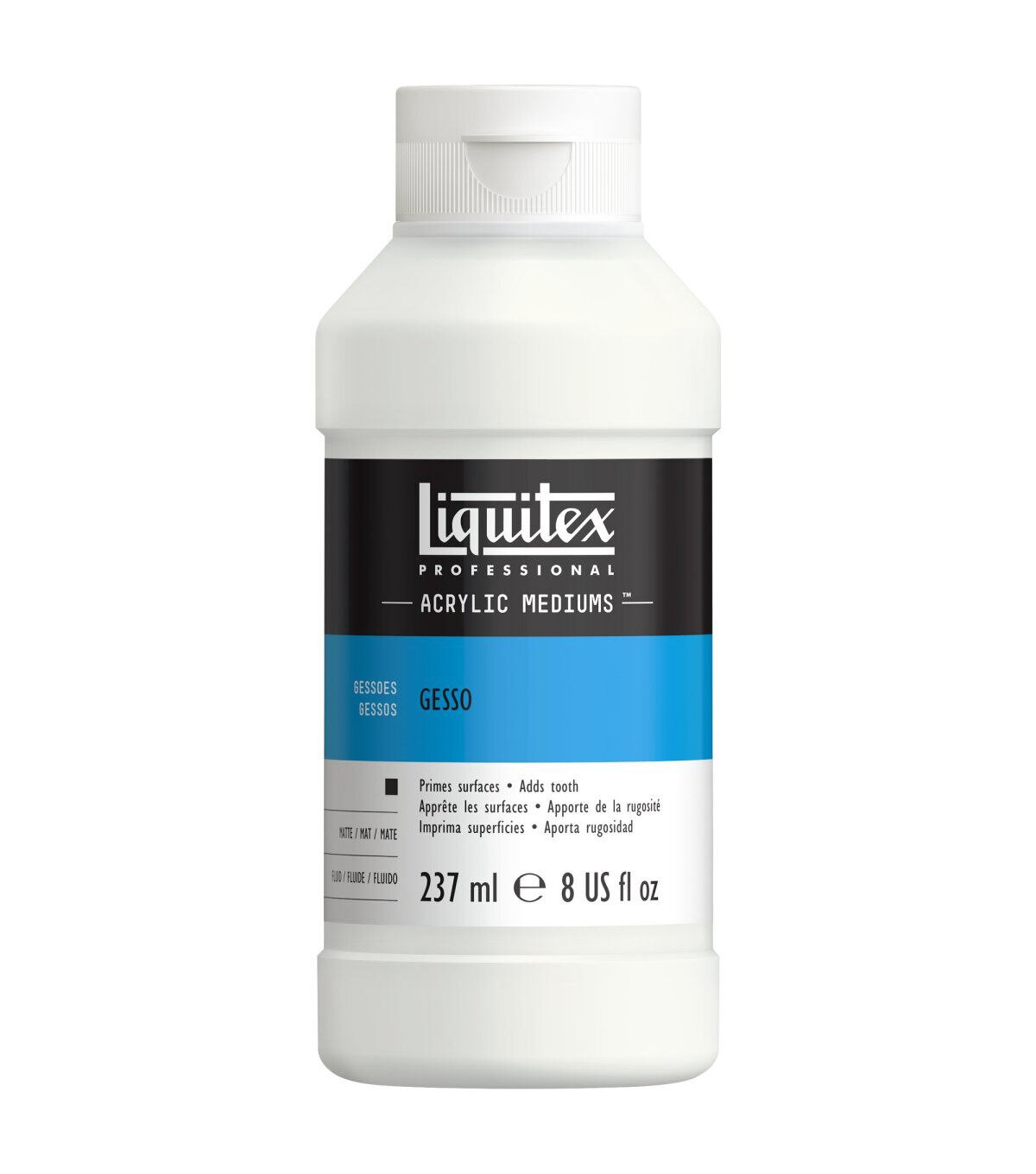 This Liquitex Gesso surface protector seals, stiffens and provides surface 'tooth' for painting surfaces. It is permanent, non-yellowing, flexible, and water resistant when dry. Use it with oil, acrylic, pastels, and other paint media. Apply it to raw canvas, harboard, paper, wood, and other non-oily porous surfaces. Sand hard, shiny surfaces before applying. Can be tinted with acrylic colors but is not to be mixed with oil paints. This package contains 8oz/237mL of Gesso.
