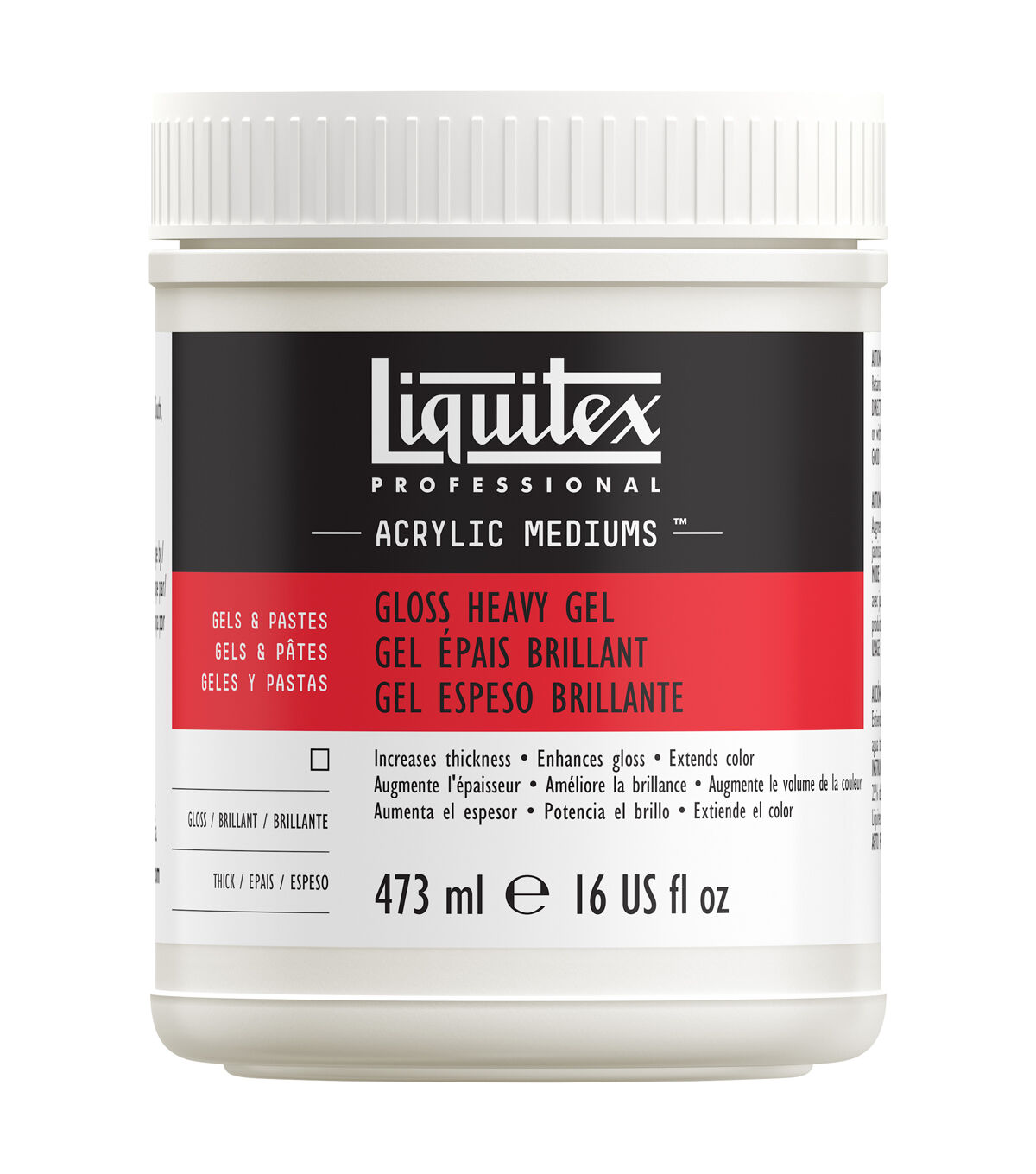 Liquitex Gloss Heavy Gel features heavy body consistency and produces a brilliant gloss impasto color with oil- like drag. It retains crisp brush strokes and extends paint volume while increasing transparency. Also slows drying time and enhances blending. Mix it with acrylic color or thin by adding up to 25% water. Ideal for thick glazes and brilliant gloss impasto effects. Makes an excellent binder for pigments and additives such as sand, sawdust, stone, and more. This package contains 8oz/237mL of Gloss Heavy Gel.