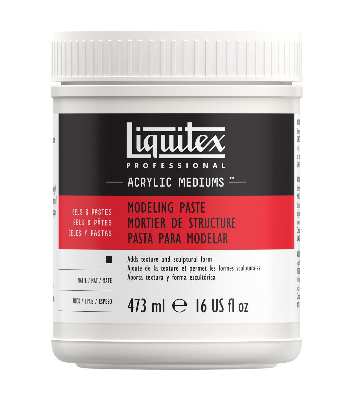 Liquitex Modeling Paste is a matte, opaque preparation of marble dust and polymer emulsion. This medium dries slowly to a very hard surface. It is permanent, non-yellowing, and water resistant when dry. Mix it with any acrylic color, or after dry apply paint to the surface. This paste can be carved and sanded but will crack if applied to a flexible surface. Not for use with oil paints. This package contains 16oz/473mL of Modeling Paste.
