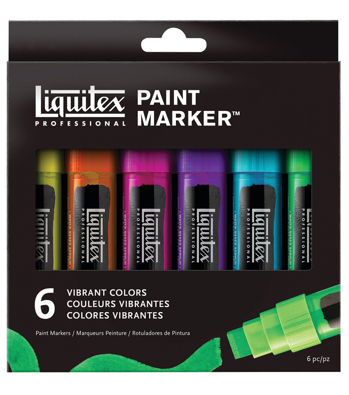 This set features a collection of professional grade, artist's acrylic markers with vibrant color that is lightfast and permanent. Great for largescale work, sketching and mixed media, the wide tip offers a thick, bold line. This set includes cadmium yellow light hue, cadmium orange hue, medium magenta, brilliant purple, light blue permanent and vivid lime green.