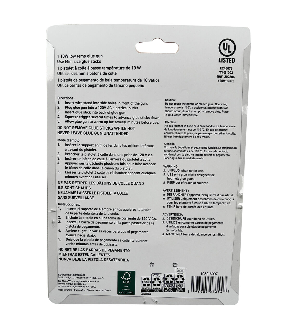 Unleash your creativity with the Low Temp Mini Glue Gun by Top Notch, a must-have in your craft supplies. This black glue gun is designed to take mini-size glue sticks, making it perfect for DIY home decor and papercrafting projects. Simply plug in the electric cord and warm up the glue gun. Use the squeeze trigger to melt the glue sticks and start creating your masterpiece.With its low-temperature design, this glue gun is safe and easy to use. You won't have to worry about accidental burns or melted glue sticking to your skin. Plus, the compact size makes it easy to handle and store when not in use.
