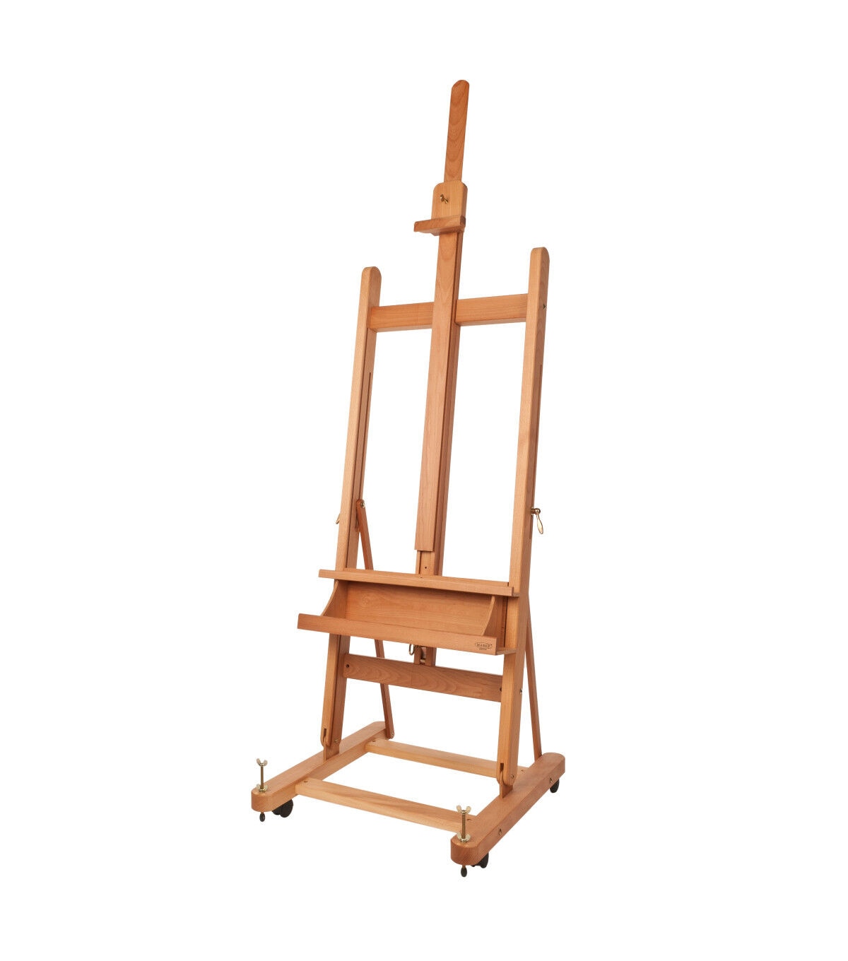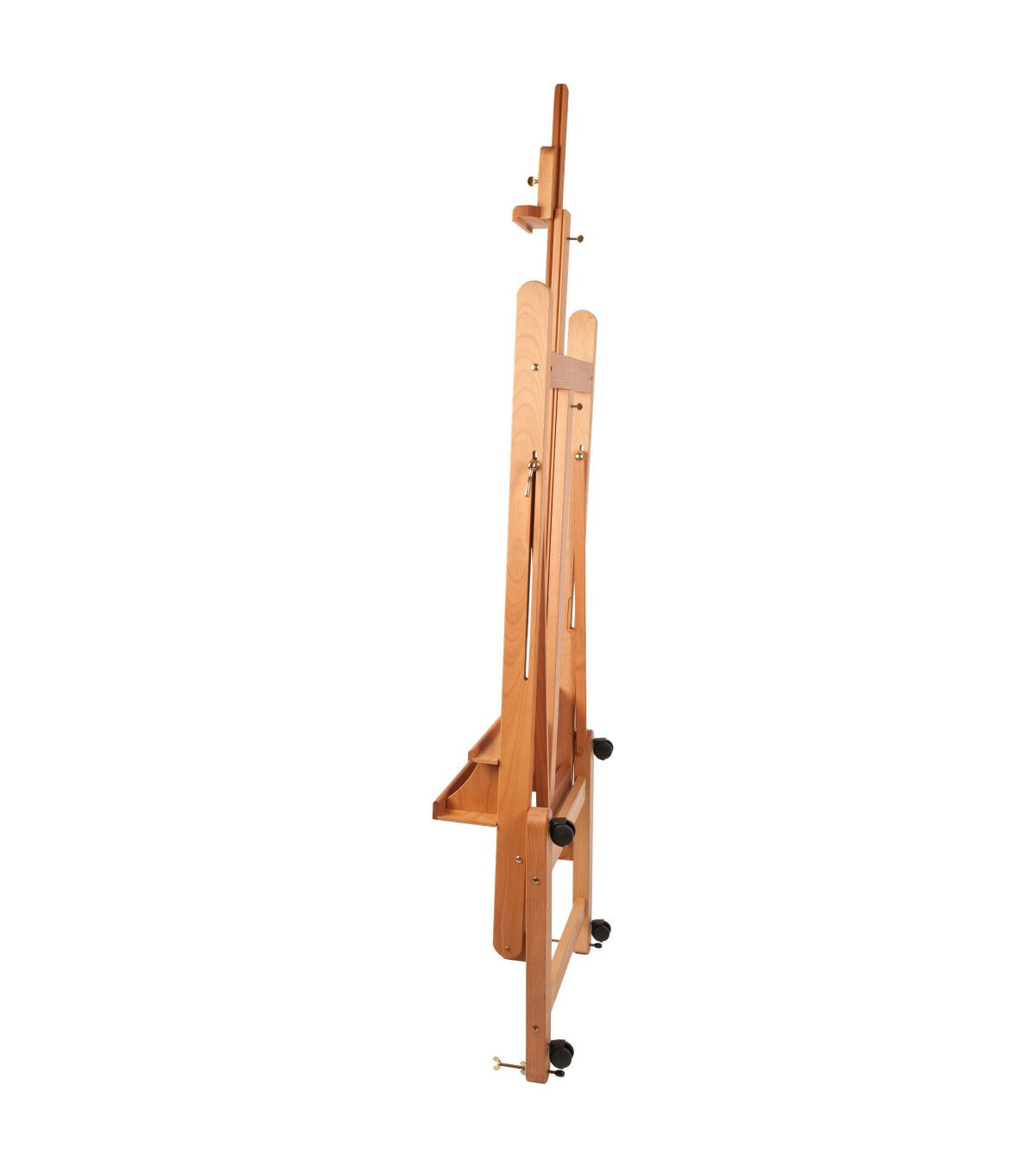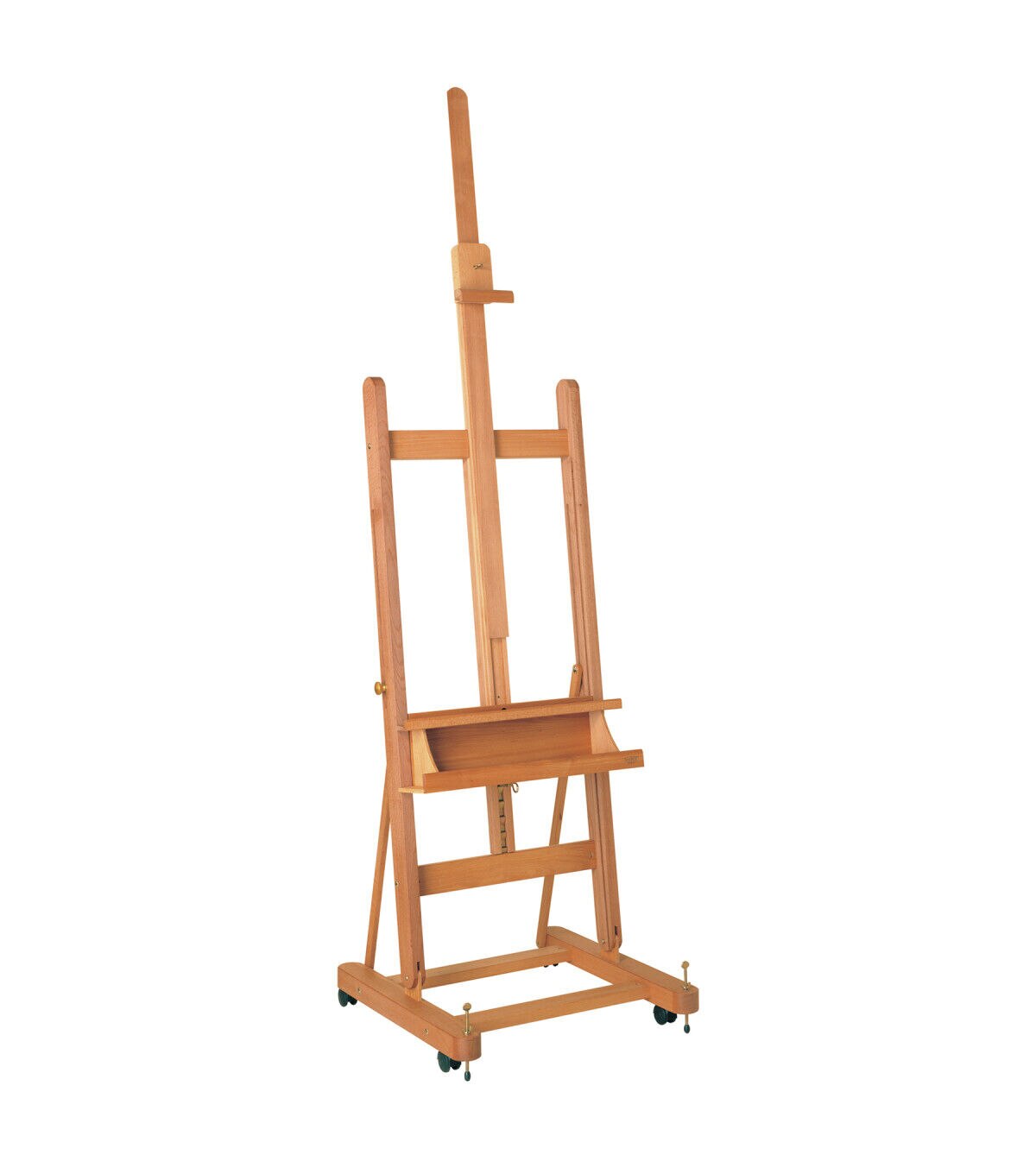 This sturdy and sleek studio easel features an H-frame design that keeps your work level and steady, as well as a storage area below the canvas ledge for tools, brushes and paints. The easel's sturdy base has four lockable wheels allowing you to move with changing light or rearrange your studio with ease. This easel comes in an easy-to-assemble kit, and features an adjustable height with a simple ratchet action.