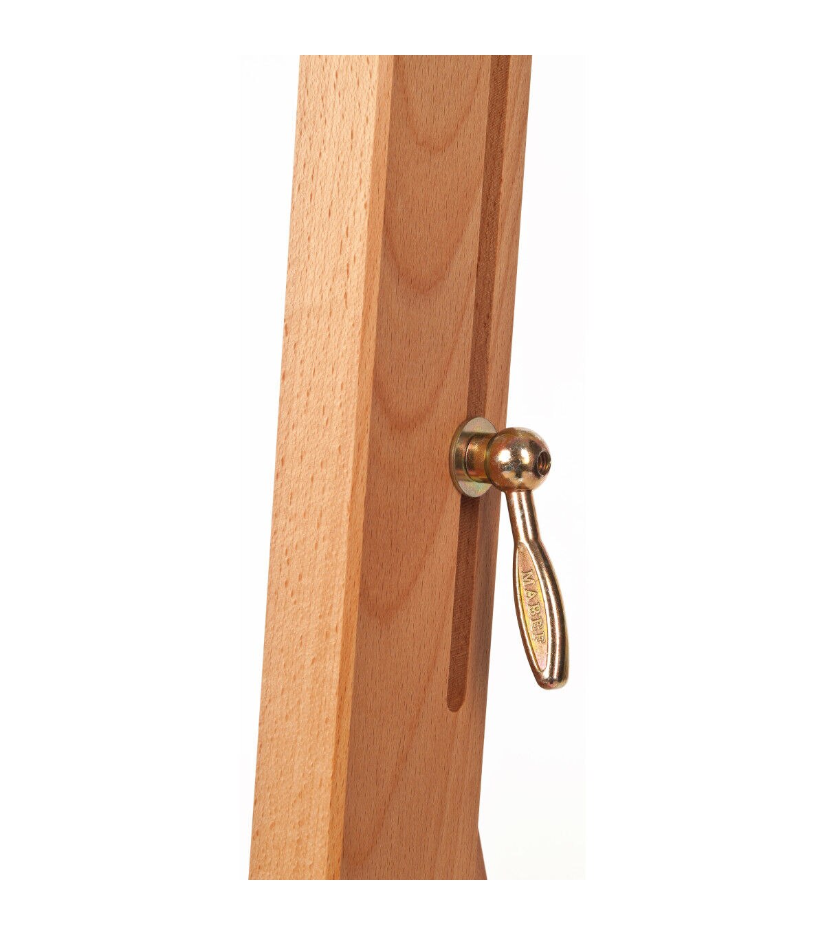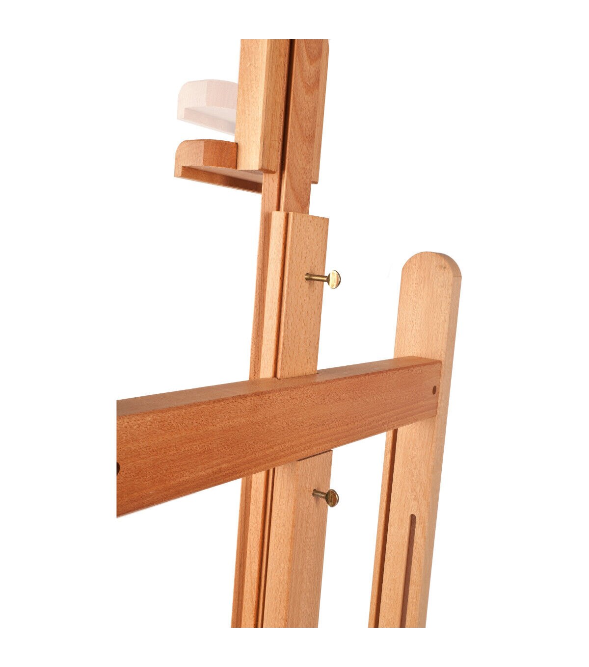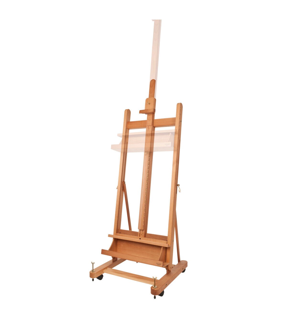 This sturdy and sleek studio easel features an H-frame design that keeps your work level and steady, as well as a storage area below the canvas ledge for tools, brushes and paints. The easel's sturdy base has four lockable wheels allowing you to move with changing light or rearrange your studio with ease. This easel comes in an easy-to-assemble kit, and features an adjustable height with a simple ratchet action.