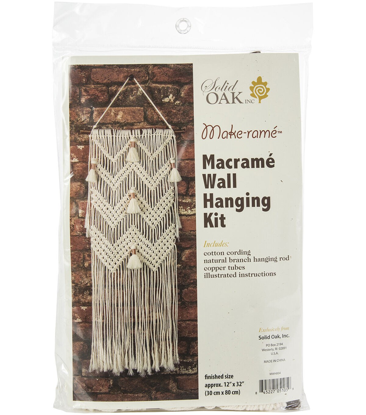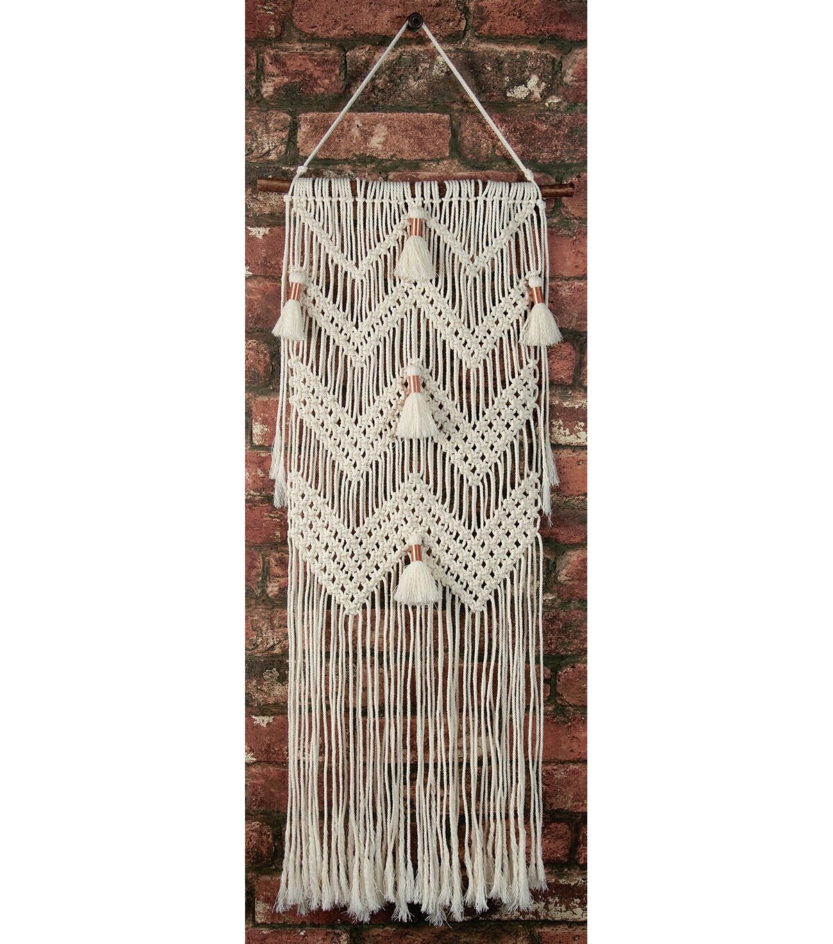 The macrame wall hanging features unique patterns. Hang in a room to add interest to your home decor. This 9.25x13 inch package contains cotton cording, natural branch hanging rod, copper tube accents and instructions. Finished size approximately 12x32 inches. Imported.