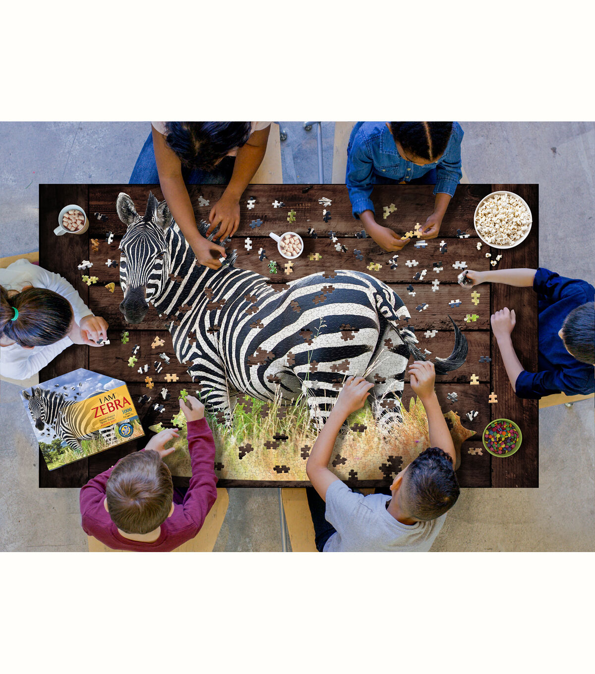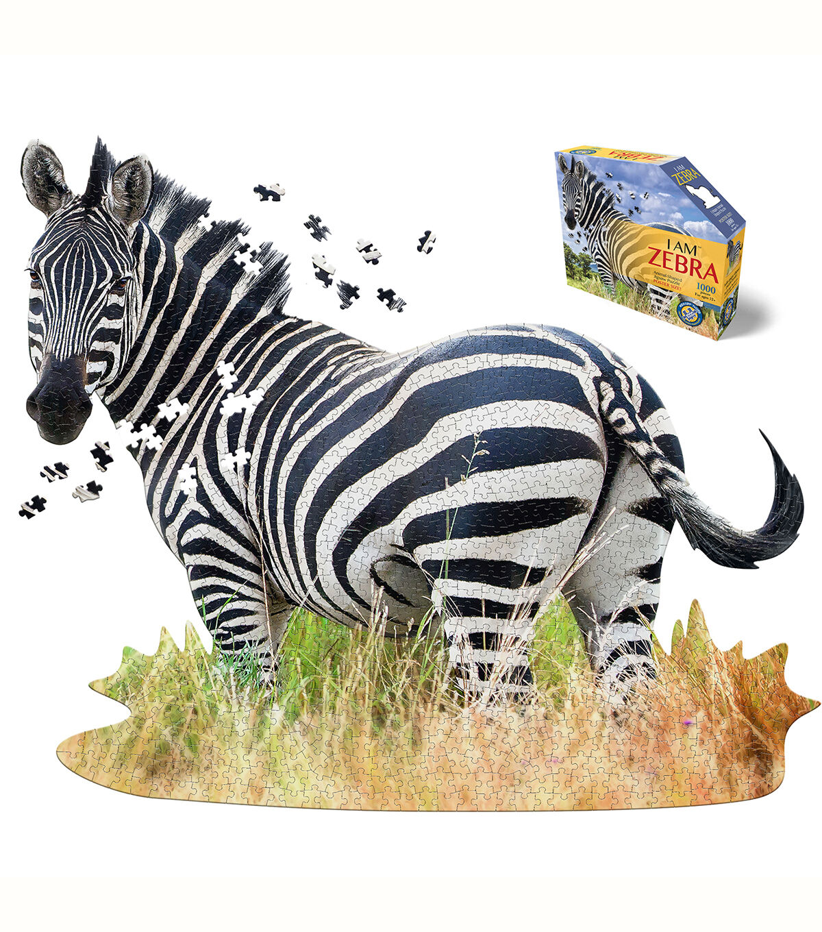 Madd Capp's 1000-piece I AM ZEBRA has a unique, animal-shaped border – ears, mane, rump, and all! No square corners, no straight edges… just a little extra challenge and a lot more fun (a few days, depending on your skill level). To bring the zebra to life, Madd Capp puzzlers typically build from the inside out, rather than the outside in. The finished puzzle is poster-sized (40" x 35") and – with a semi-gloss, photo-realistic image – pretty impressive looking! Included with each puzzle is an “extra" – an educational Fun Facts booklet. On one side is all kinds of interesting info about the animal you're puzzling. On the flipside is a full puzzle image to use as a reference or hang as a poster. Packaged securely in Madd Capp's signature five-sided box, puzzles are designed to be displayed on a shelf, just like books in a library. For ages 12 and up.