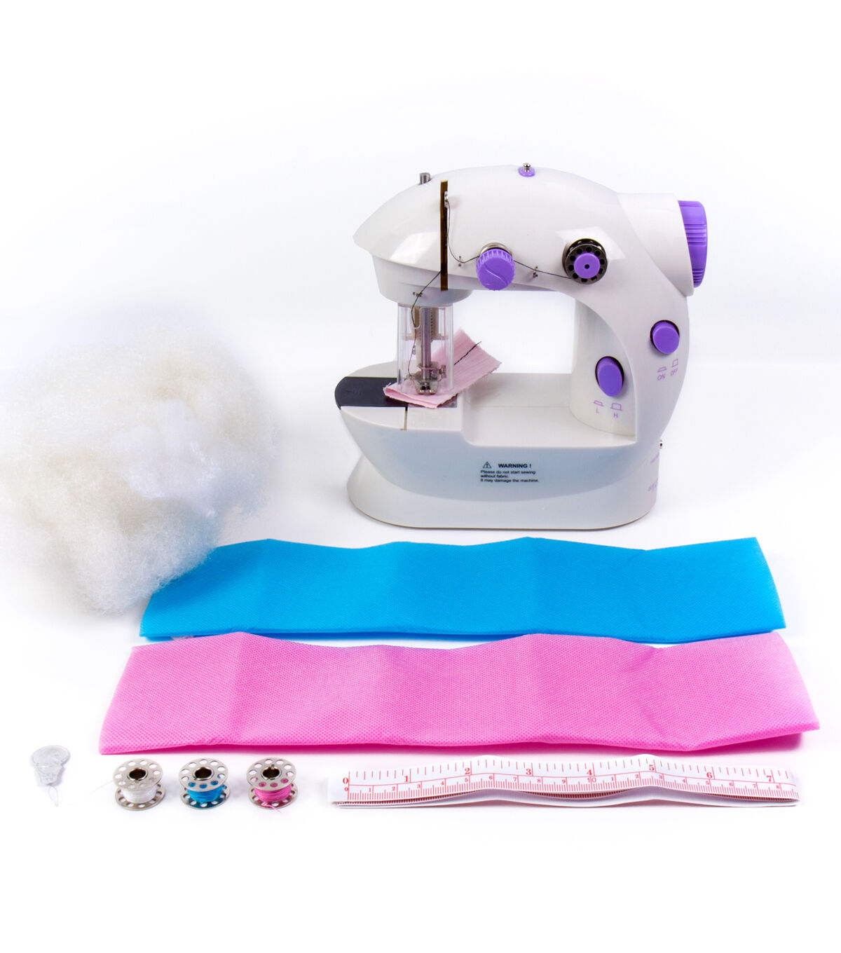 - Kit Includes: 1 Battery-Powered Sewing Machine, 1 Metal Needle Threader, 1 Bag of Fiberfill (0.8 oz., 22g), Measuring Tape, 1 Sticker Sheet, 2 Fabric Sheets (1 Pink, 1 Blue) 12 in. x 12 in. Each, 3 Spools of Thread (1 White, 1 Pink, 1 Light Teal) 15 yds. Each, Easy-to-Follow Instructions