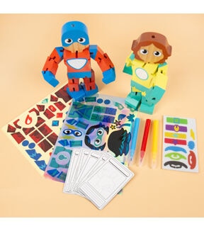 - Kit Includes: 3 Mini Markers, 2 Sticker Sheets, 1 Felt Sticker Sheet, 6 Double-Sided Trading Cards, 1 Metallic Sticker Sheet, 2 Posable Wooden Superhero Figures, Easy-to-Follow Instructions Age Range: 6+