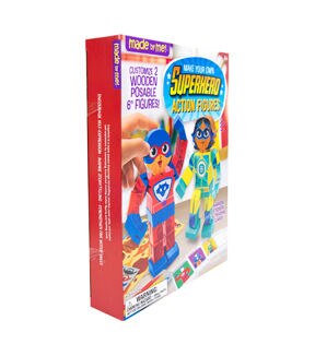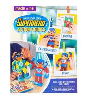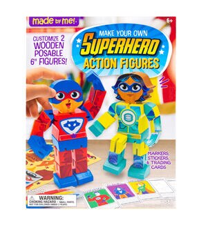 Immerse yourself in an epic creative adventure and Make Your Own Superhero Action Figures with Made By Me! Complete with 2 wooden action figures with moving arms and legs, mini markers, stickers, and even customizable trading cards, this one-of-a-kind set makes it easy to unleash your creative superpowers! Color each figure to life, add embellishments with metallic decals and adhesive stickers, then customize the trading cards for endless epic adventures! This one-of-a-kind arts & crafts kit for kids ages 6-8 not only provides hours of imaginative play, but it also ignites imagination, promotes fine motor skills, and creates cherished memories for both kids and adults alike!