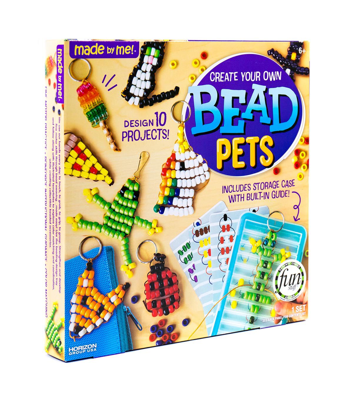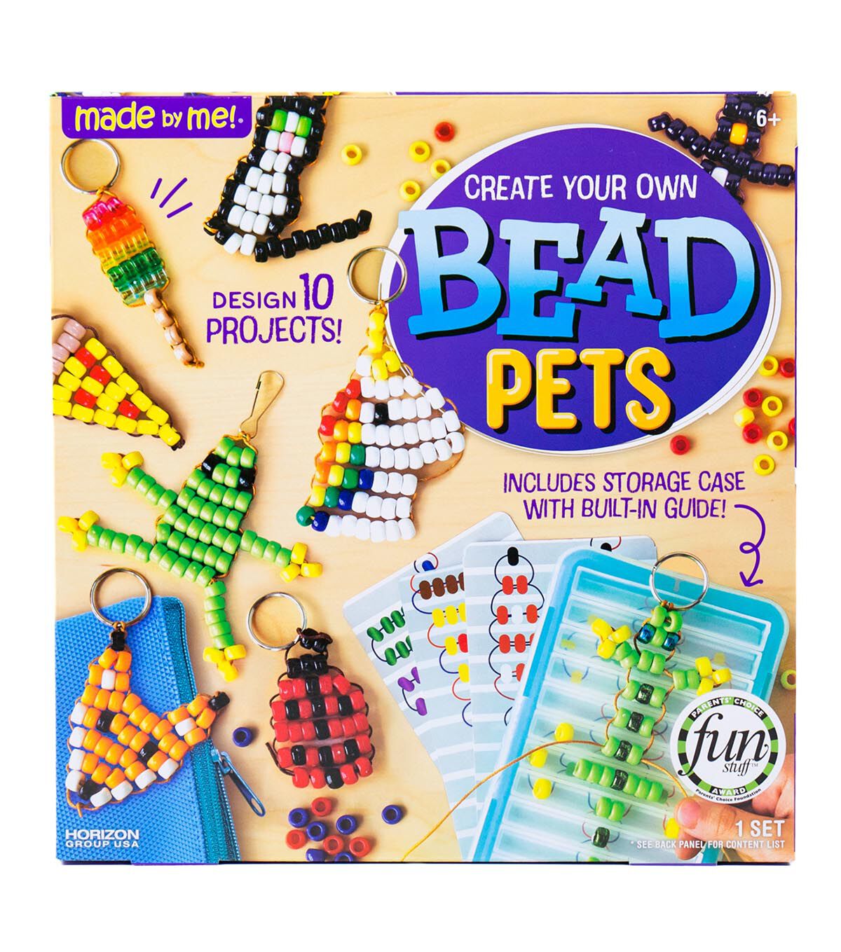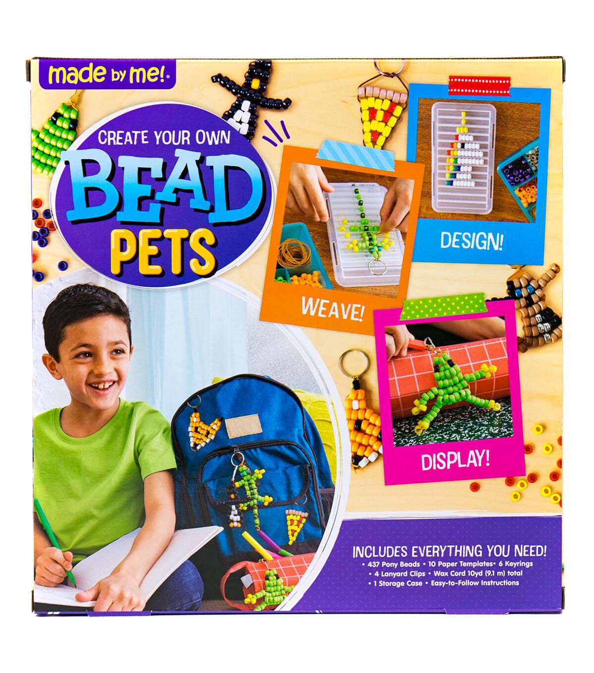 Create Your Own Bead Pets with Made By Me! Complete with over 400 vibrant pony beads, key rings, lanyard clips, design templates, and a storage case with built-in project guides this set includes everything you need to create 10 different projects! From bunnies and penguins to ladybugs and frogs, pick from 5 different design templates to learn how to transform colorful pony beads and thread into the cutest little creatures! When you're finished designing, hook your creations onto a backpack, set of keys, or another accessory using the included keychain rings and clips store your leftover beads inside the case to create a zoo-full of fun later!