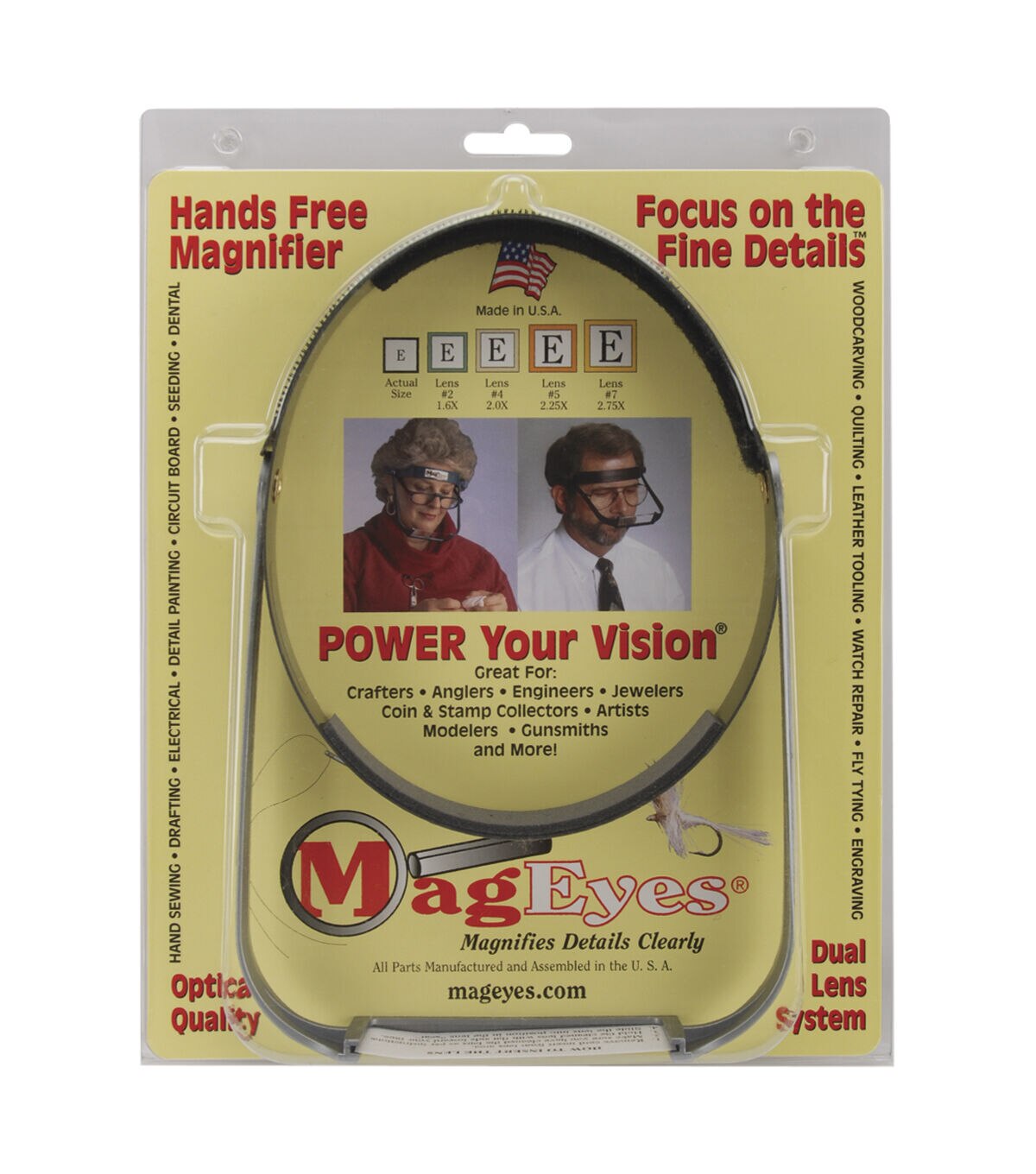MagEyes is a lightweight magnifier made of black and gray colored plastic. It's cushioned headband fits comfortably around the forehead like a visor and is fully adjustable. Attached to the headband is an optical-quality acrylic magnifying lens. The lens can be directly in the line of vision and locked securely in position or moved up and out of the way when not needed. Can easily be worn with prescription glasses. This package contains one headband and two lenses: 1.6X and 2.0X. Made in USA.Electronics must be returned with a receipt and in an unopened box. Please work directly with the manufacturer if products are damaged upon purchase, or become defective within the warranty period.