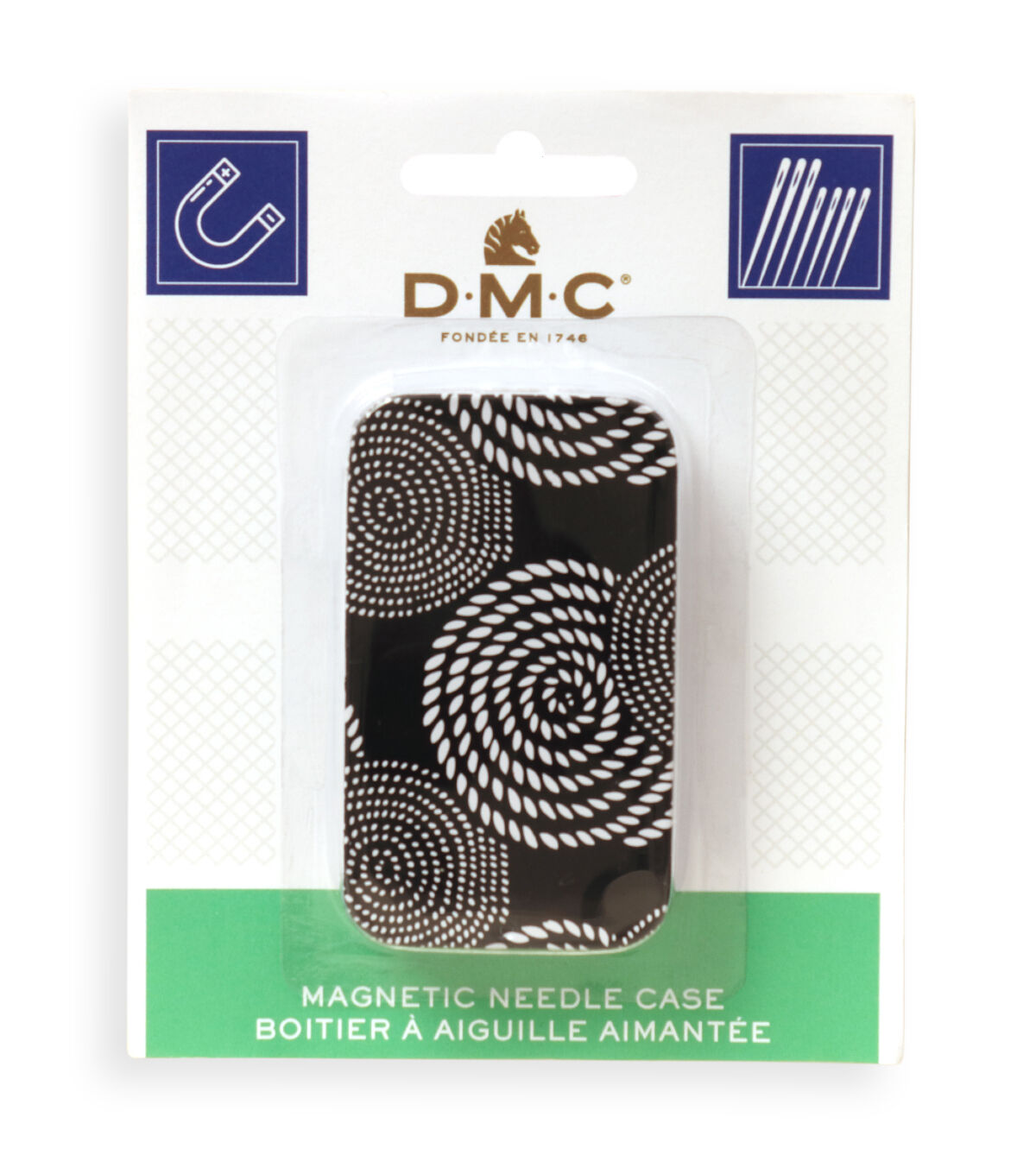 DMC-Magnetic Needle Case. The strong magnet holds needles securely inside the case! Has a stylish cover. This package contains one 1- 5/8x2-3/4 inch magnetic needle case (needles not include). Imported.