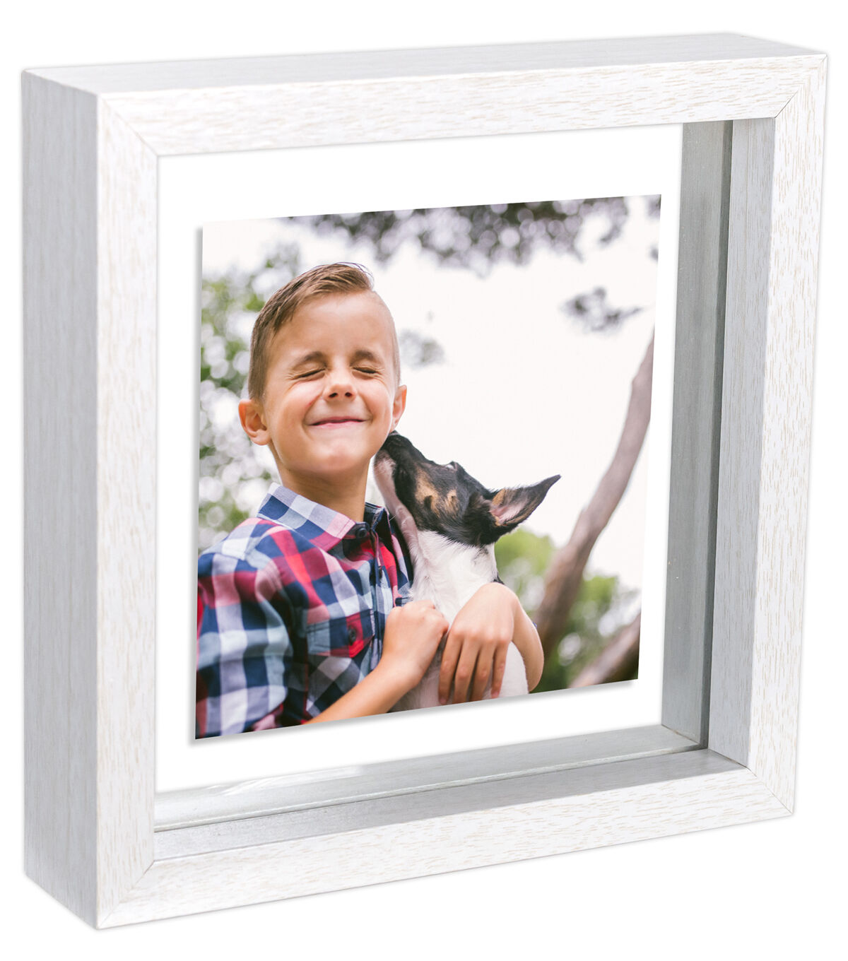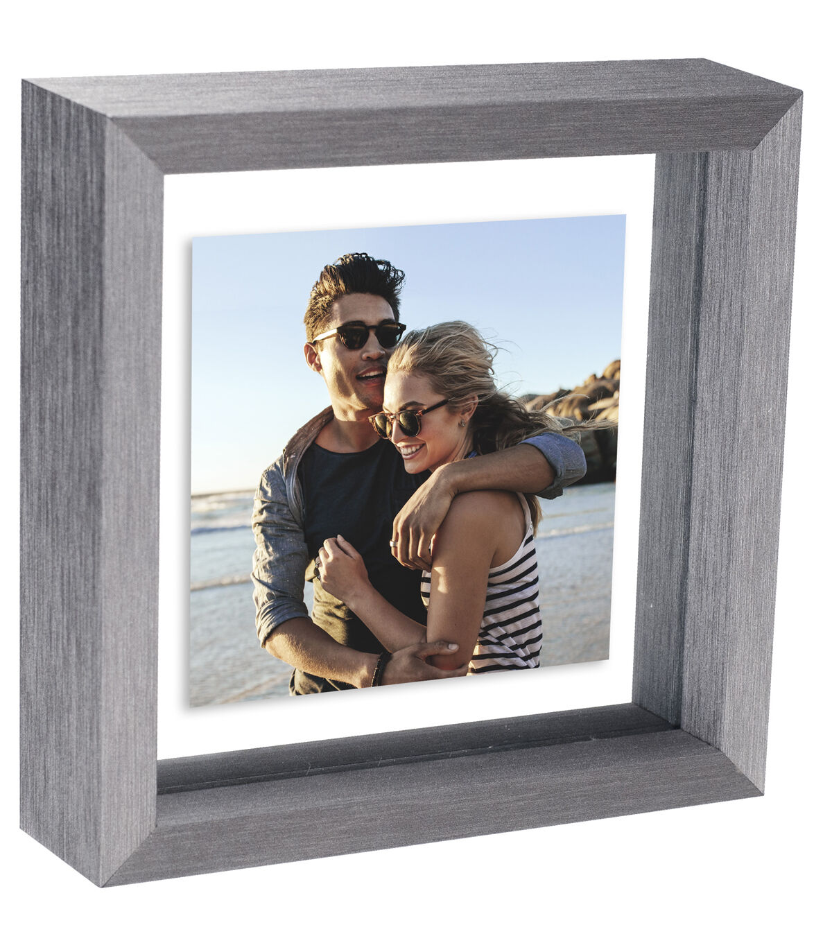 Add a touch of rustic style to any space with this Gray Floating Glass Picture Frame. This beautiful frame is the perfect way to display your treasured family photos. The frame holds one 4” x 4” photo within two pieces of 5” x 5“ glass and is constructed of a durable quality MDF moulding with a wood grain finish. It’s freestanding design makes it perfect for horizontal or vertical display on any surface. Malden’s Frames include a durable glass front that will protect and showcase your beautiful photos for years to come. Simple to load with quality swing tab on bottom to easily slide out glass and change photo. Celebrate your precious memories with Malden International Designs Gray 4x4/5x5 Photo Floater Frame.