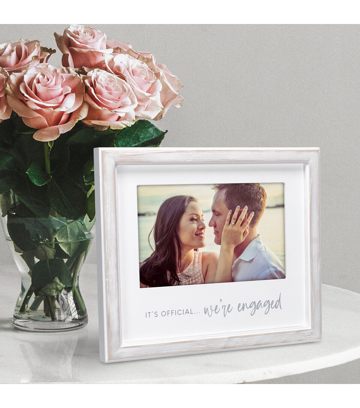 Sentiment picture frames are the perfect way to display your treasured photos. This engagement frame holds one 4" x 6" horizontal photo. The frame is constructed of quality MDF wood, hand-crafted with a lightly textured natural and white surface. The stepped white frame moulding has a smooth MDF wood mat printed with a sentiment. This decorative frame features the title "It's official...we're engaged" silkscreened in gray. This picture frame stands on an easel, making it ideal for displaying on a tabletop or shelf. Optionally, use the attached hardware to create a unique wall display. Swap out photos easily with swing tab closures. Included in the frame is a durable glass front that will protect and showcase your beautiful photo for years to come. Perfect for gift giving. Create a loving display of treasured memories with Malden International Designs sentiment frames.