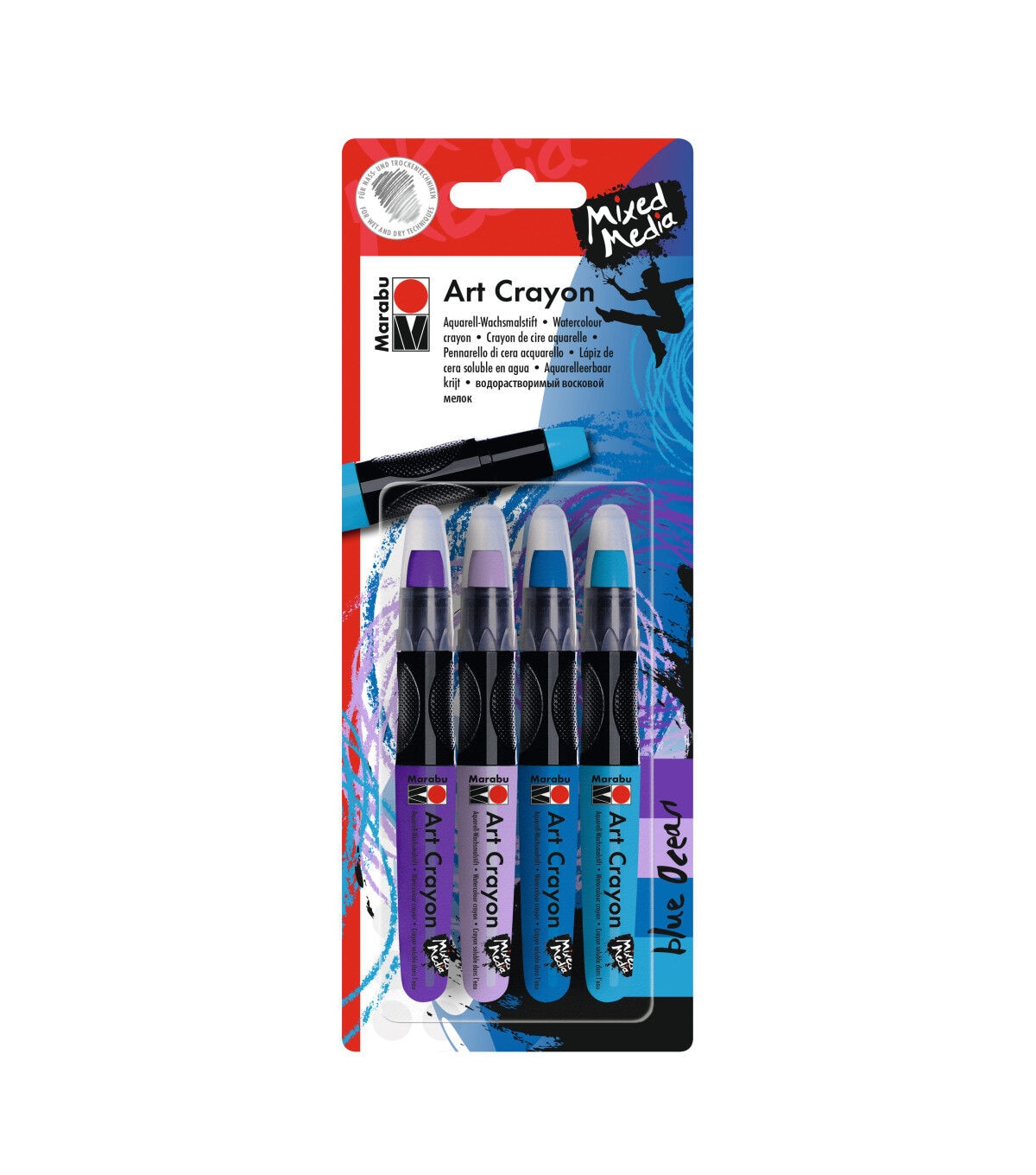 These water-soluble wax crayons offer a smooth, soft consistency ideal for scrapbooking, wipe-stenciling, stamping and mixed media projects in general. The vivid colors can be smoothly mixed for brightly colored blending and a watercolor appearance when combined with water. Use on paper, canvas, wood and more. The Blue Ocean Set includes plum, lavender, gentian and sky blue.