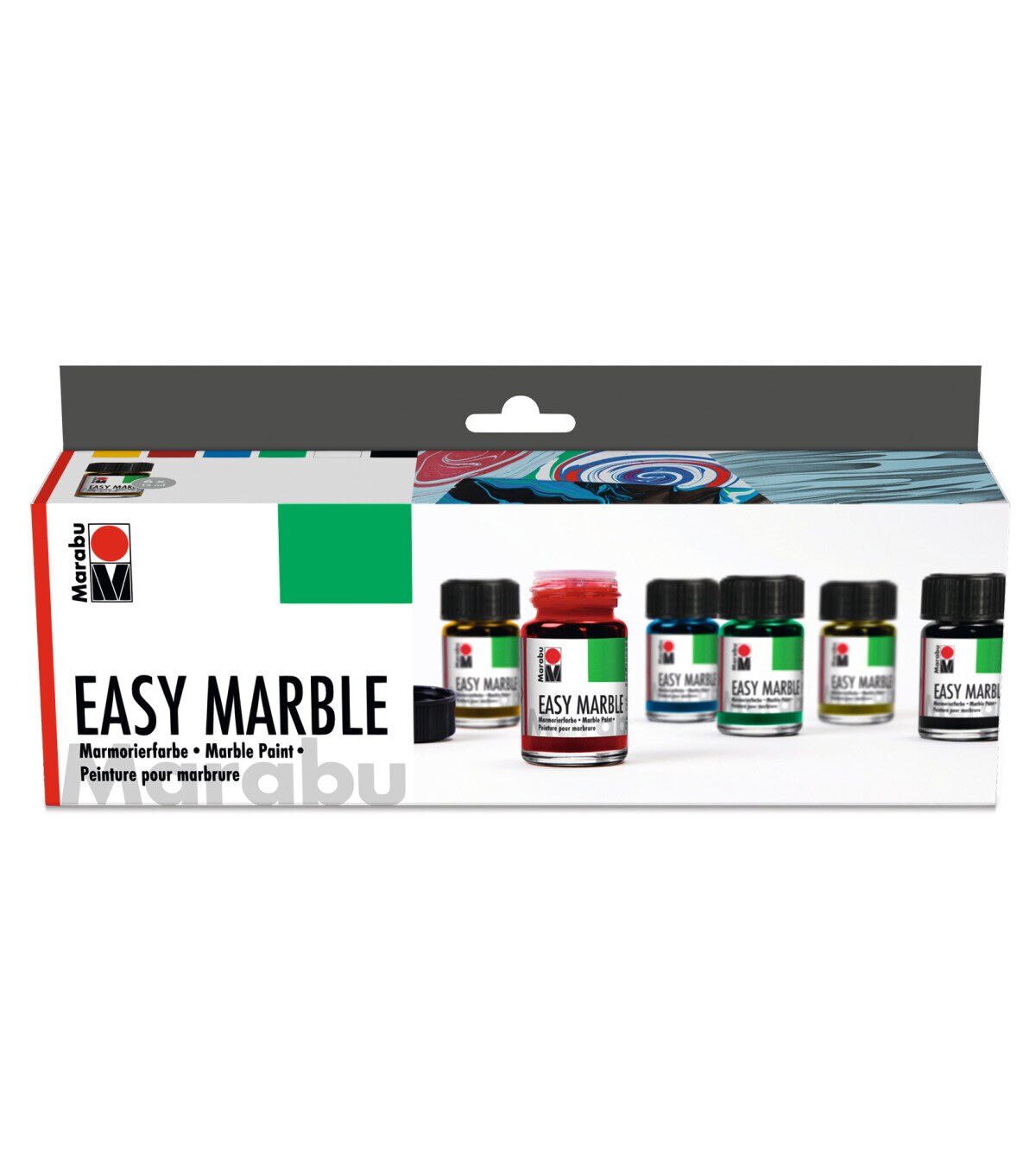 Drip, dip, done! Marabu Easy Marble is ideal for creating immersion marble effects on plastic, glass, acrylic plastic, wood, papier mache, blown eggs, metal, polystyrene and for marble effects on paper. This set offers a great way to get started on marbling all kinds of items. Just drip the paint into water and dip your item in, easily creating unique designs with every dip.