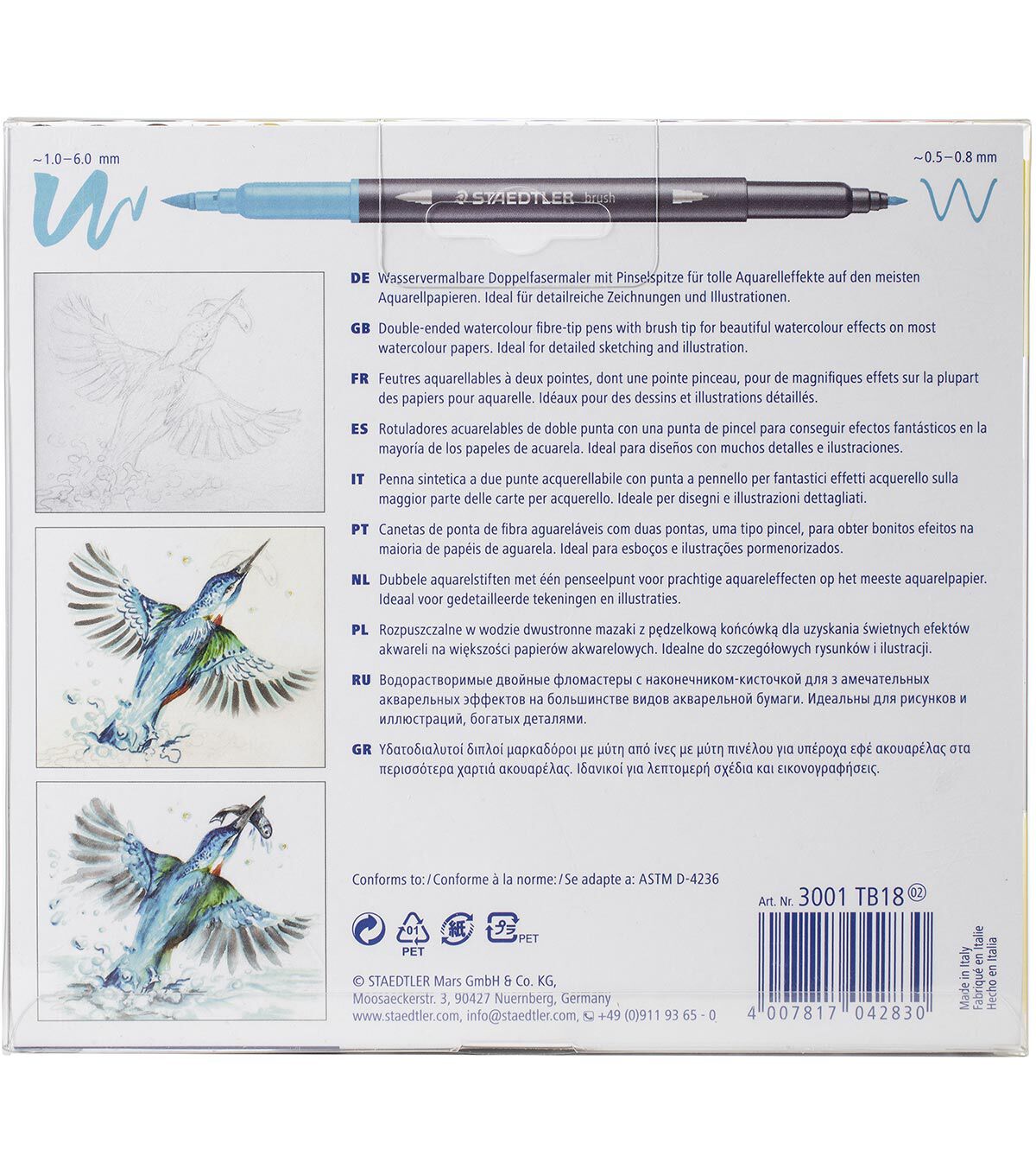 Double-ended watercolor pens with brush tip for beautiful watercolor effects on most watercolor papers. Ideal for detailed sketching and illustration. This 7.25x6.75 inch package contains 18 double-ended watercolor brush markers in assorted colors. Conforms to ASTM D 4236. Imported.