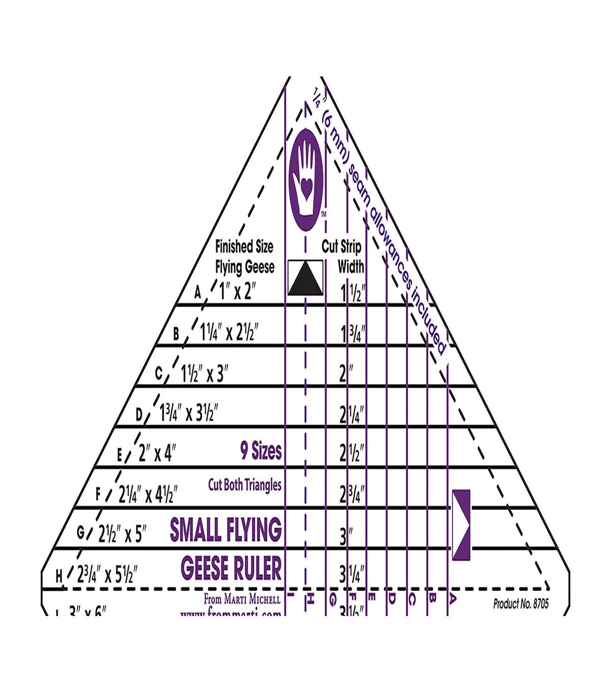 Making accurate flying geese patches for quilting and other fabric projects is a breeze with the Marti Michell Small Flying Geese Ruler. You can create beautiful patchwork combinations in the range of 1 x 2 inches to 3 x 6 inches using this flying geese ruler.