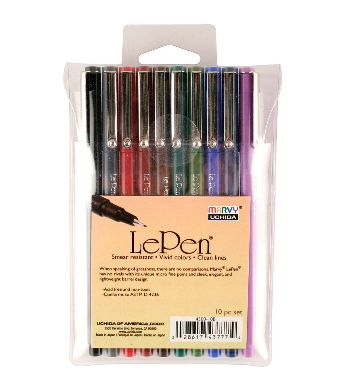 Uchida-Le Pen Dark Set: Assorted Colors. The Le Pen has a smooth writing, micro-fine plastic point and a sleek barrel design! This package contains ten 5-1/2 inch long pens. Non-toxic. Acid free. Conforms to ASTM D4236. Imported.