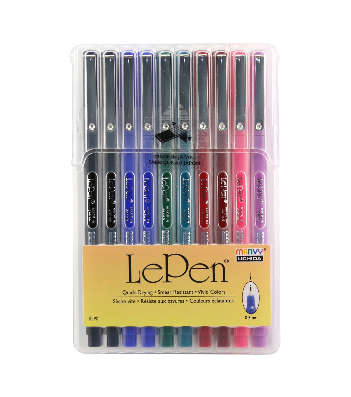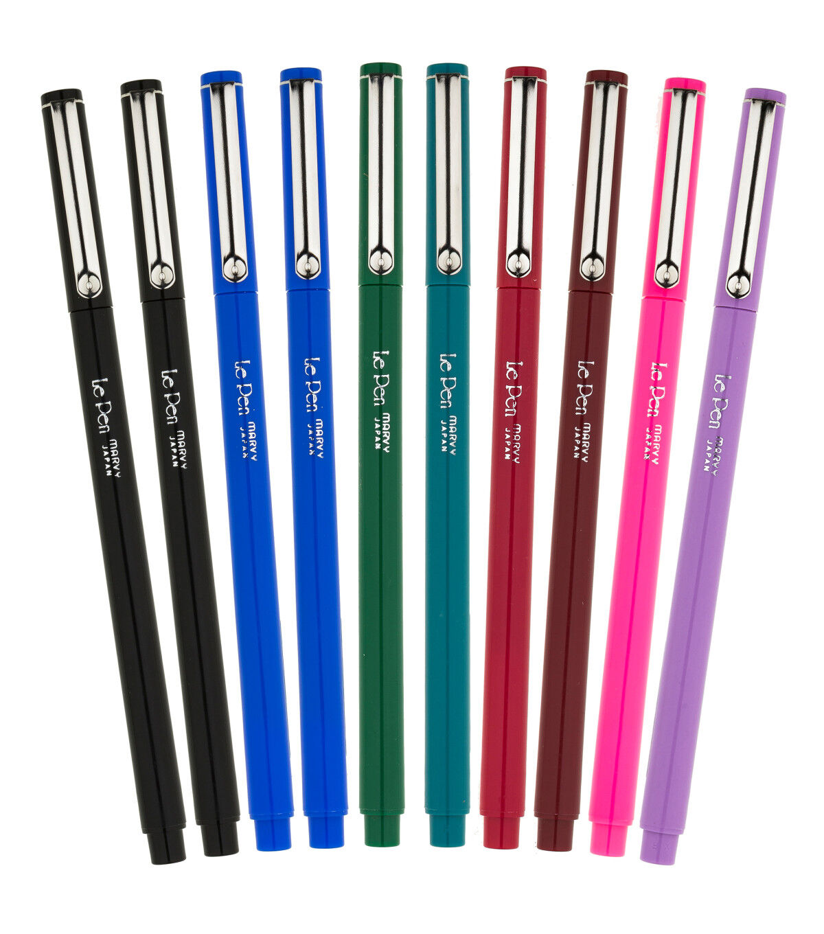 The LePen features micro-fine plastic point that ensures durability and smooth writing, making even paperwork a pleasant experience. Great for business forms, notebooks, diaries, memo pads, letters, journals, yearbooks, and scrapbooks. This petite, elegant writing tool fits snugly in a pocket organizer or pencil case. This set includes two each of black and blue, and one each of red, green, pink, burgundy, teal and lavender.