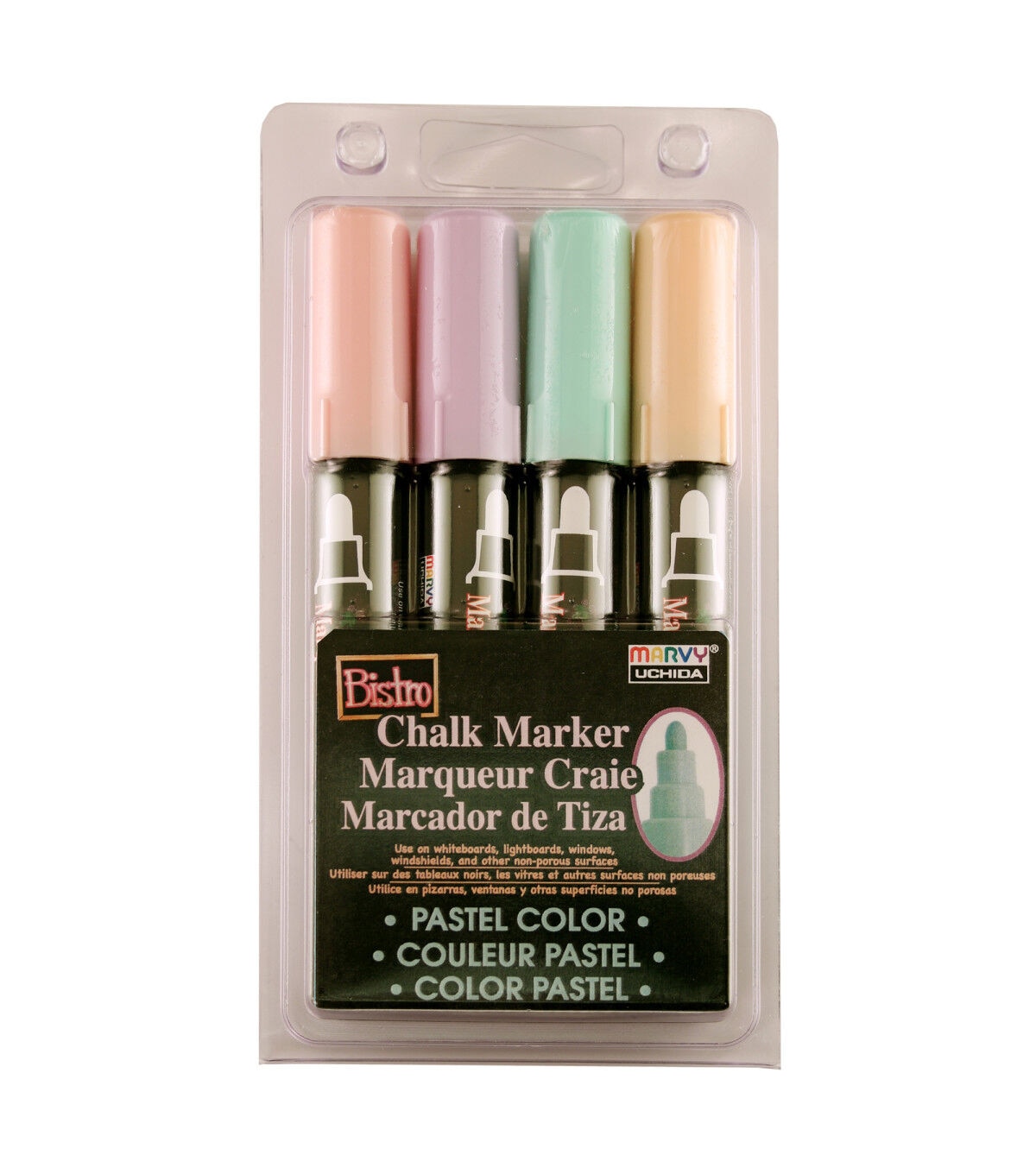 Bistro Chalk Markers are ideal for drawing on chalkboards, light boards, windows and even windshields. A wonderful way to create chalkboard art and to attract attention, they are highly pigmented yet easily erasable with a damp cloth so that your message is easily updated! Use them on most non-porous surfaces, including chalkboards, light boards, windows and windshields. This pastel set includes orange, green, pink and purple.
