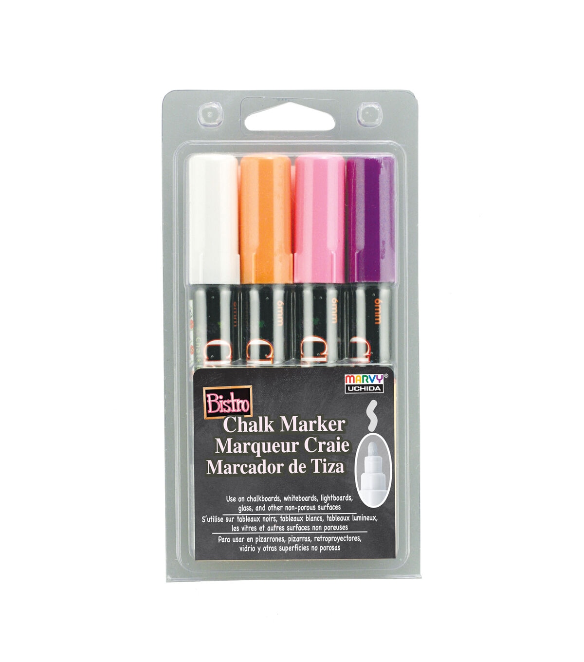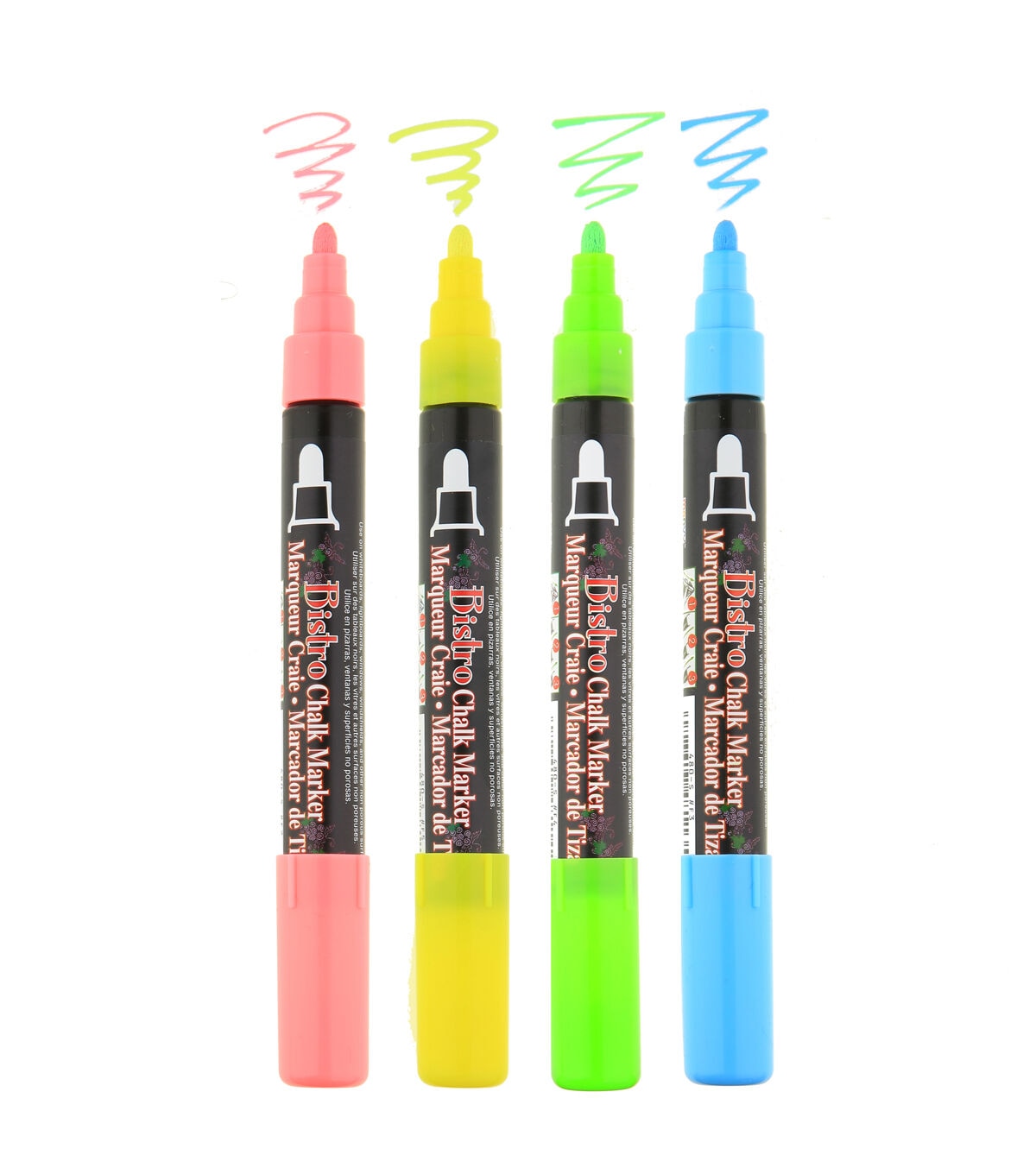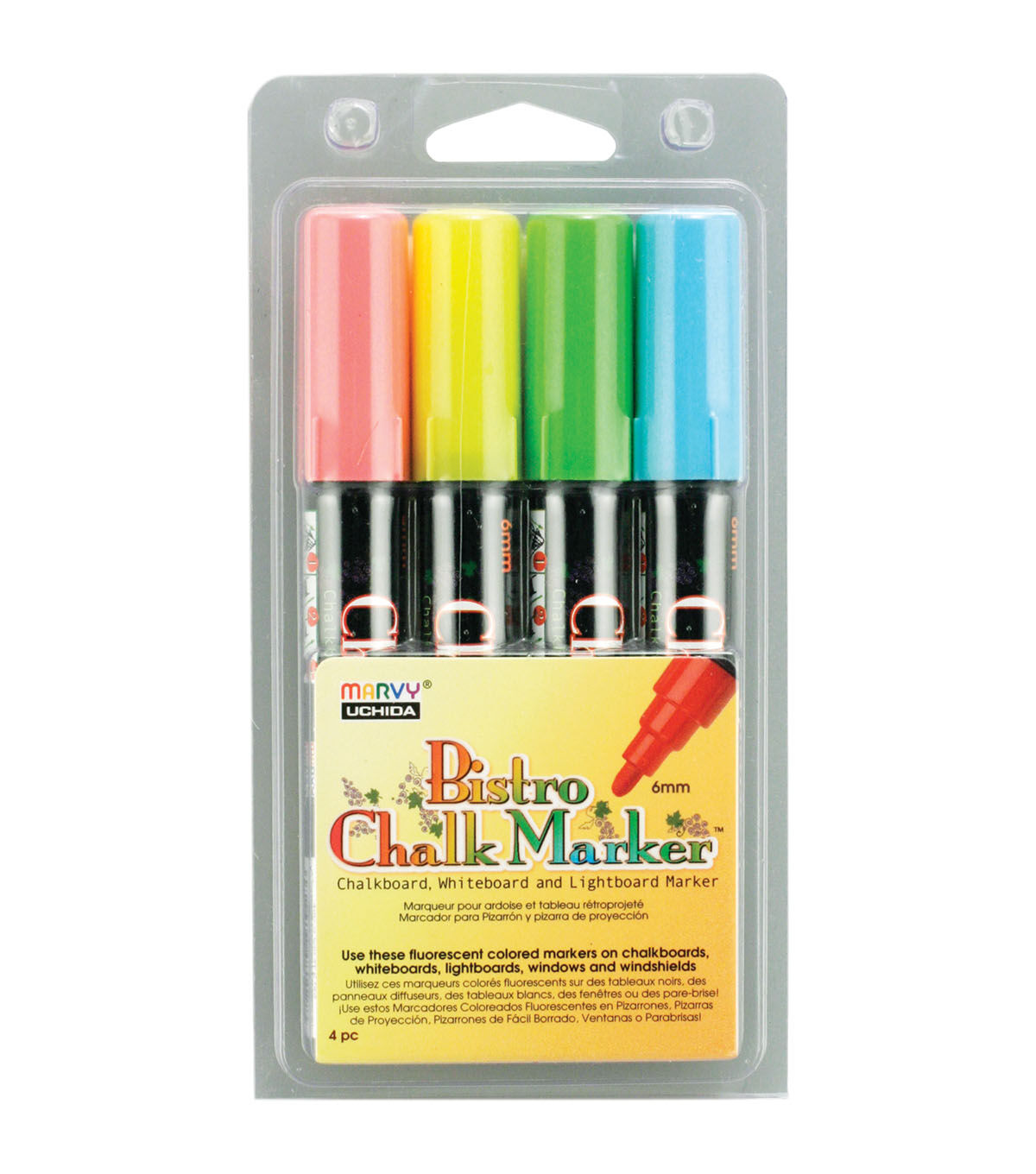 MARVY UCHIDA- Bistro Chalk Marker. Creates a dustless smooth layer of rich fluorescent colors that are water-based, non-toxic and fade resistant. For use on black boards, glass, backlit boards and more, just wash off with a damp cloth. This package contains four markers with 6mm tips in pink, yellow, green and blue. Conforms to ASTM D4236. Imported.