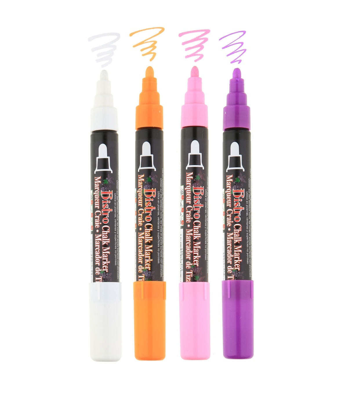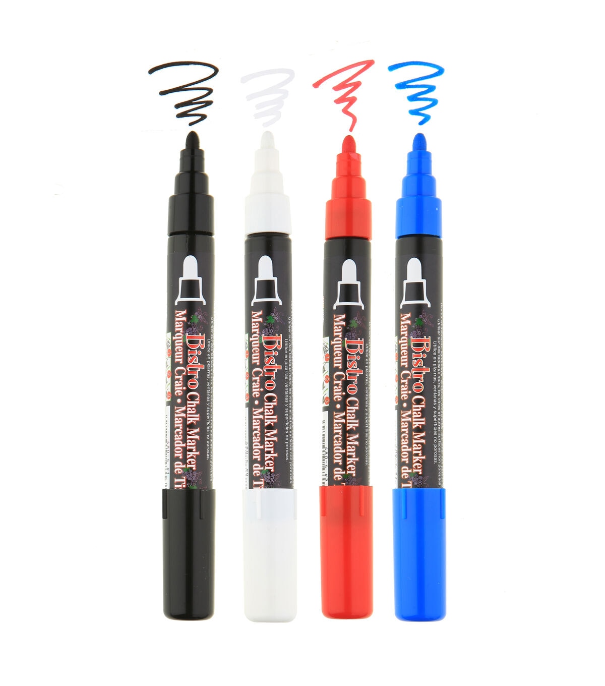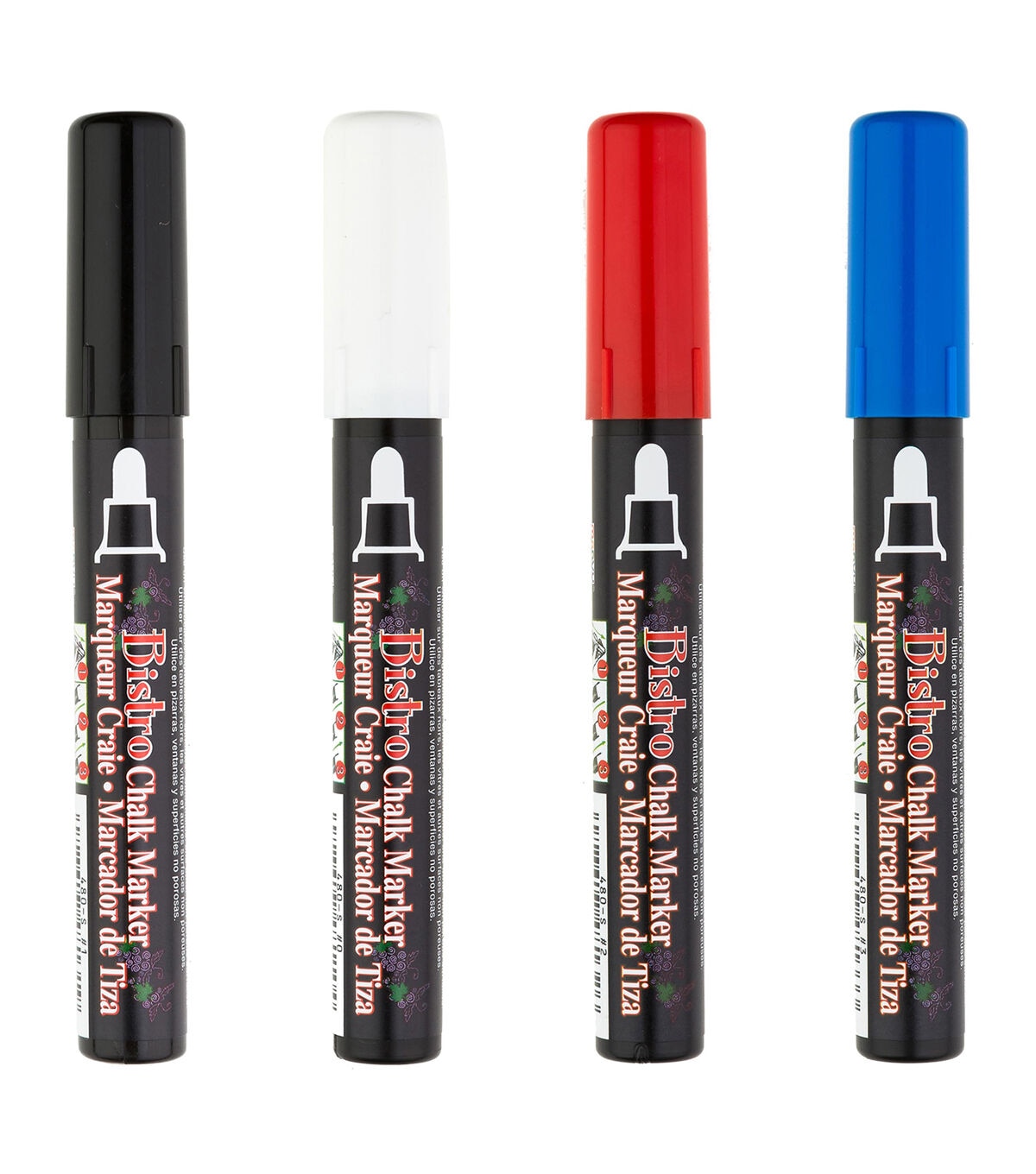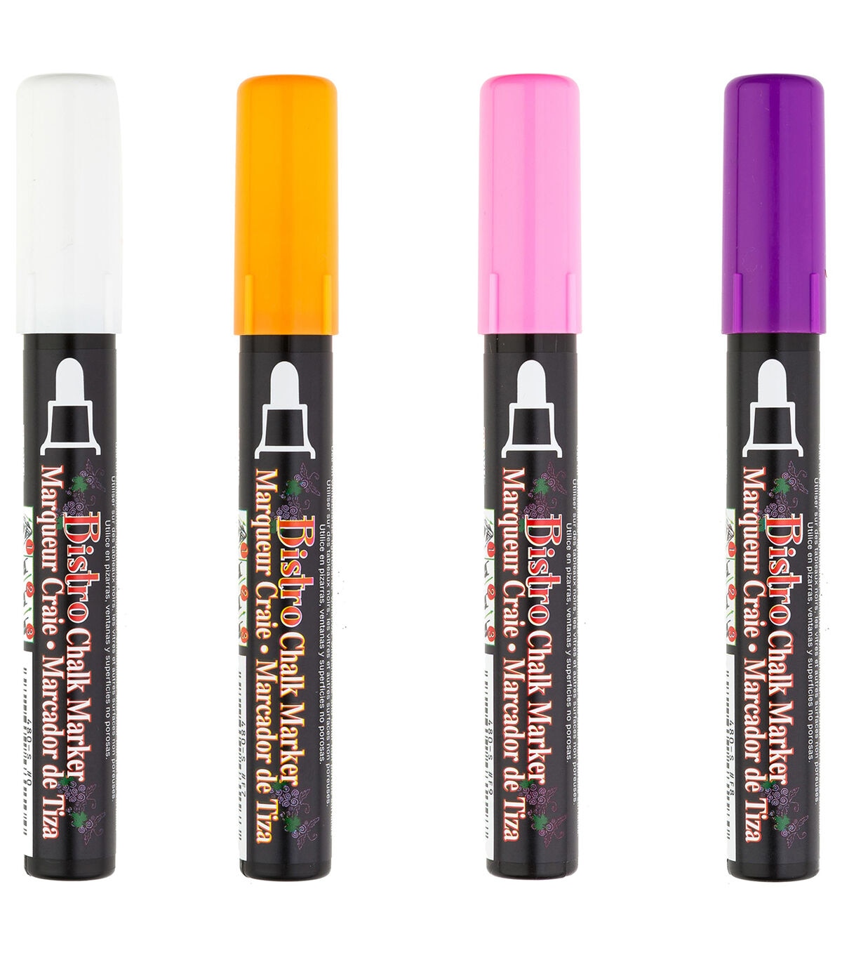 MARVY UCHIDA- Bistro Chalk Marker. Creates a dustless smooth layer of rich fluorescent colors that are water-based, non-toxic and fade resistant. For use on black boards, glass, backlit boards and more, just wash off with a damp cloth. This package contains four markers with 6mm tips in pink, yellow, green and blue. Conforms to ASTM D4236. Imported.