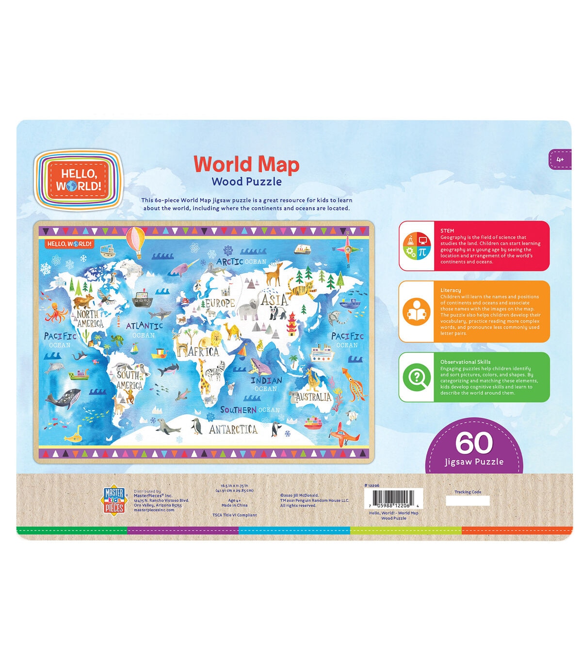 This MasterPieces 16.5" x 11.75" 60pc World Map Puzzle is the perfect way to teach kids about geography! Learn all the continents and oceans when you put together this 60 piece World Map puzzle. It is great for children ages 4-10 years old.