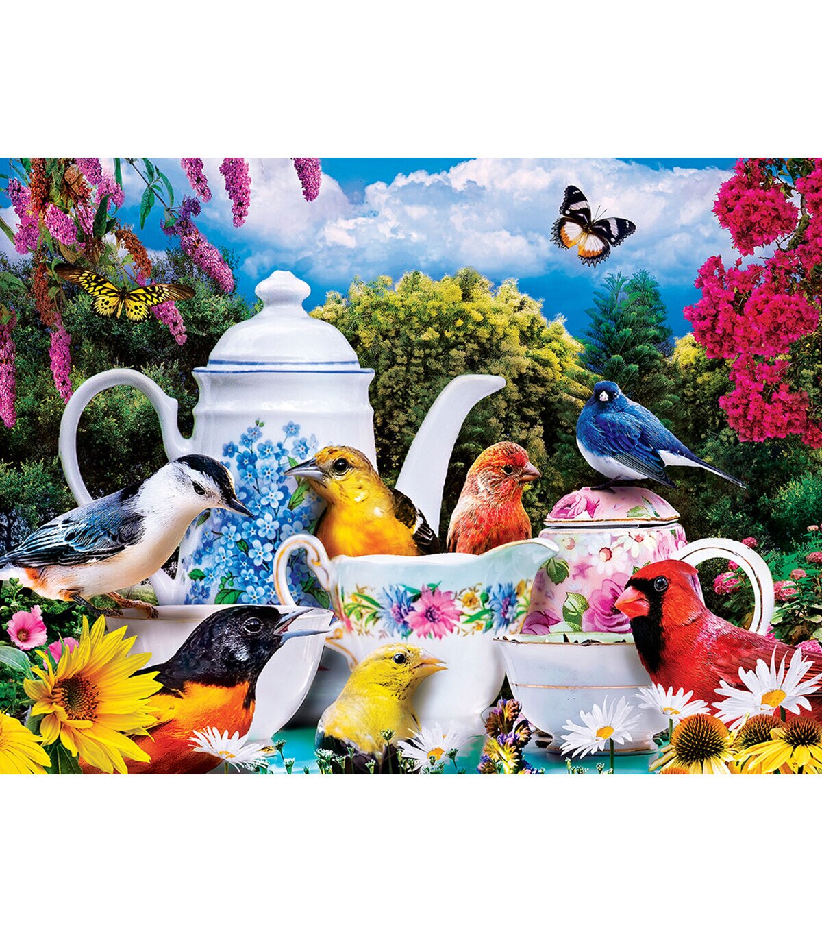 MasterPieces' 18" x 24" Memory Lane 300PC EZ Grip Puzzle is the perfect blend of exciting and adorable. Catch these adorable cardinals and bluebirds taking a quiet respite with a spot of tea. The EZ-Grip die-cut used to make this puzzle offers larger puzzle pieces for easier visual and grip that snap together perfectly, without compromising image quality. To reduce their impact on our environment, the chipboard used in these puzzles is made of recycled material.