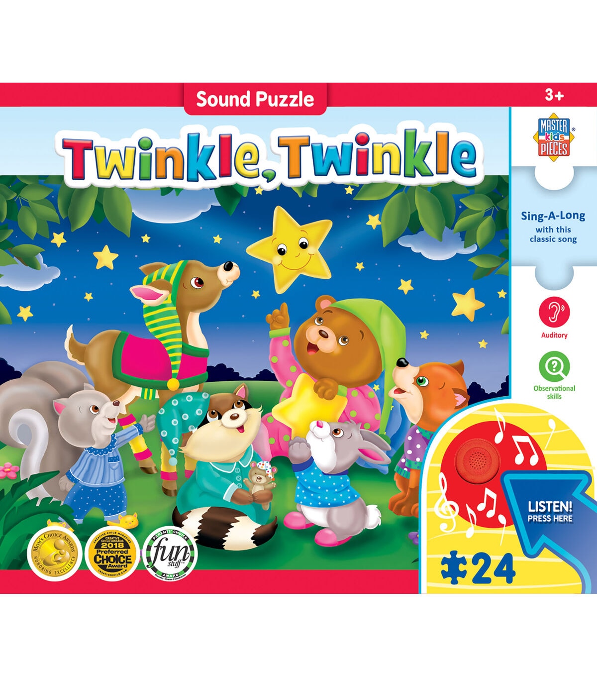 MasterPieces is an USA Arizona based Puzzle & Game Company. For over 25 years we've specialized in creating jigsaw puzzles for both children and adults. From new puzzlers to the avid puzzle enthusiasts, we design our puzzles using thick durable puzzle board to offer a higher quality puzzling experience. Our puzzles are environmentally friendly and designed with non-toxic soy-based inks. Jigsaw Puzzles make a great gift for anyone who enjoys a relaxing evening activity or a mind-bending challenge! The MasterPieces Kids collection offers a wide variety of puzzles with vibrant colors and unique themes and styles. The Right Fit Guide was developed with your little one in mind and is designed to help match the piece count and piece size to the age and skill level of the child. Enjoy piecing together wildlife, silly characters and images with hidden shapes and patterns to help little ones develop their cognitive skills and have fun! Our high-quality packaging will let you save, store, and enjoy puzzling time and time again. When you choose MasterPieces, quality isn't just a promise, it's our guarantee.