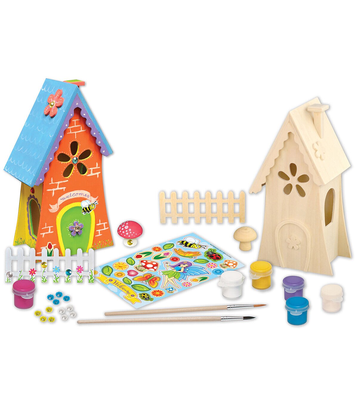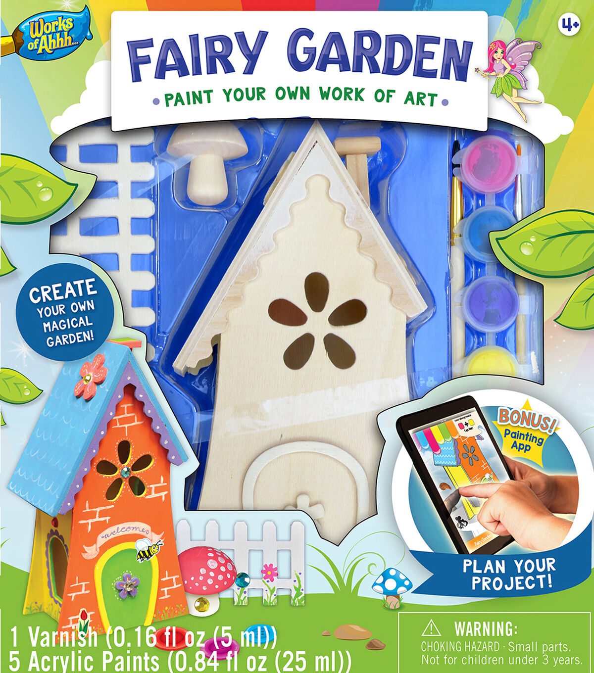 The Works of Ahhh Fairy Garden Wood Paint Kit is made of real wood, and includes everything you need to create a beautiful work of art. It is the perfect gift for every art loving kid. This pack includes one wood fairy house, one wood picket fence, one wood mushroom, 12 gem stones, two artist-quality paint brushes, five non-toxic acrylic paint tubs, one non-toxic varnish tub, one sticker sheet and one instruction sheet with painting guide.