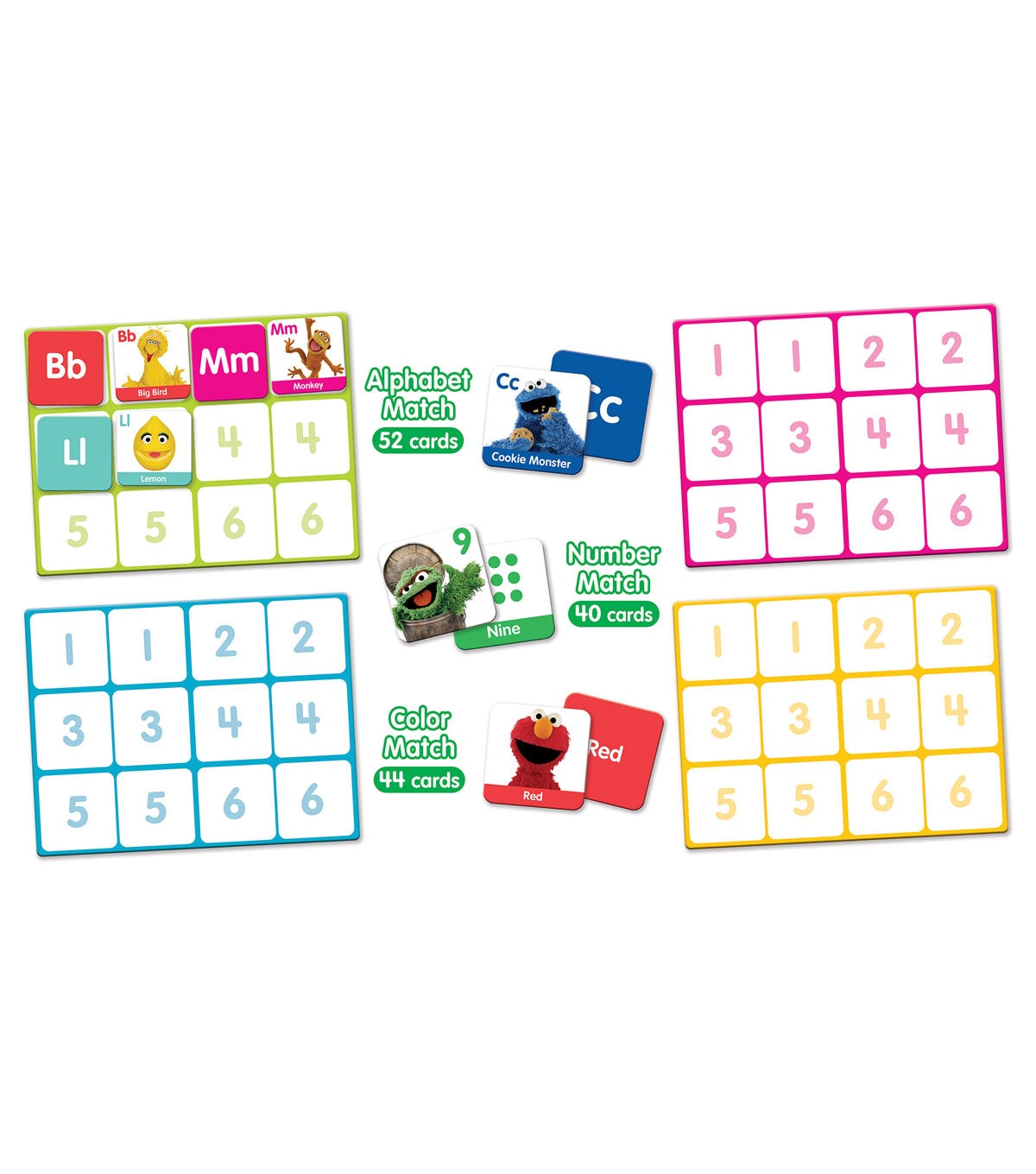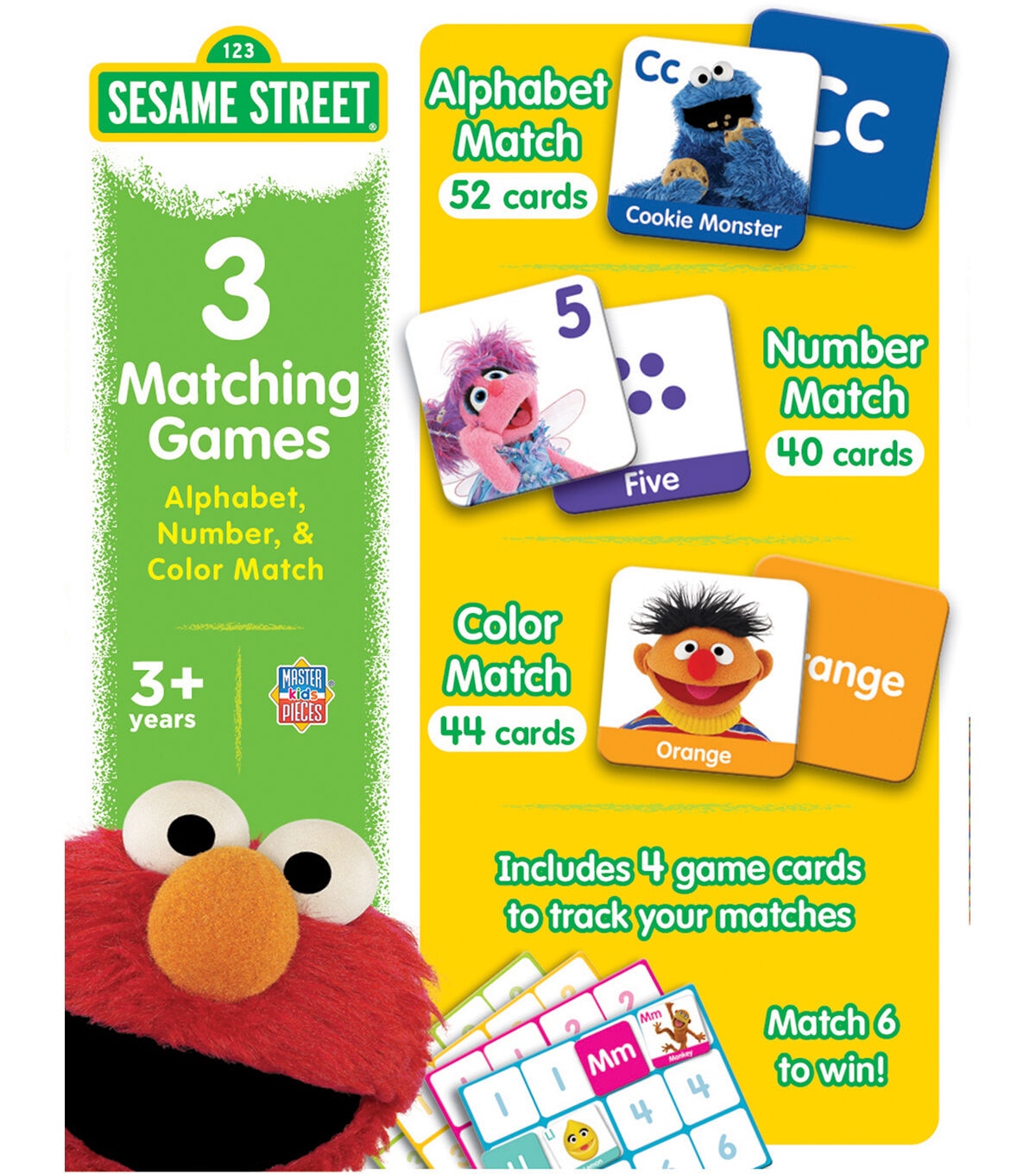 Enjoy family game night with this Sesame Street 3-in-1 Matching Game by MasterPieces. This game includes three sets of matching cards featuring different educational themes. Alphabet Matching with 26 matching pairs, Number Matching with 20 matching pairs, and Color Matching with 22 matching pairs. Matching cards feature Sesame Street furriest, silliest Muppet friends. Game comes with 4 game boards featuring 6 matching spots each to keep track of matches. Allows for shorter game play with only 6 matches for the younger ages. Challenge your memory and have fun trying to find the pairs. Play with the game boards or with a traditional game play and collect the most matches by the end of the game to win!