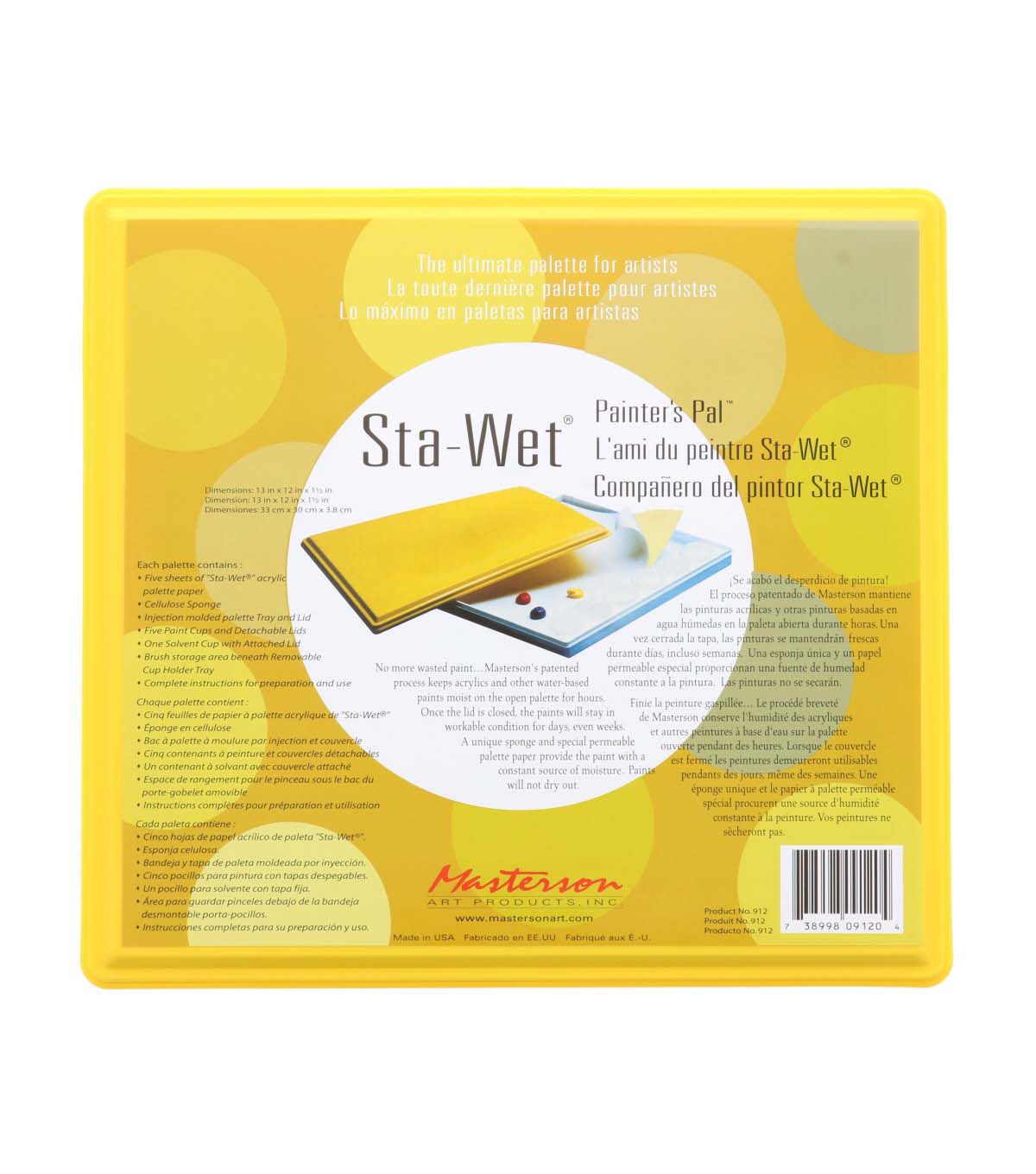 This Painter's Pal Palette is part palette, part paint station - it features a removable air-tight lid, brush storage space, five air-tight paint cups and a special cup for thinner. This kit also includes Sta-Wet Palette sheets ideal for acrylic paint and a sponge to keep your palette box damp.