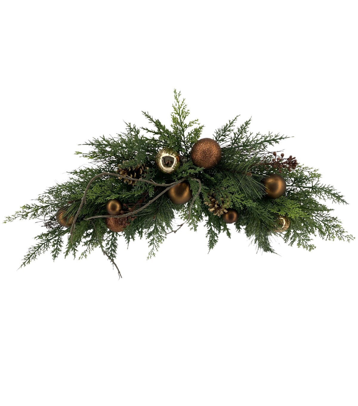 Lend a dash of freshness to your home decor this holiday season with the Christmas Bronze & Gold Bauble & Pine Wreath, Garland, Swag, and Teardrop by Bloom Room. These pieces are designed with lush green pine needles, pinecones and bronze-toned bauble accents that flaunt a matt, metallic or glittery finish. You can use these beautiful pieces to adorn the front door, a window or the mantel.