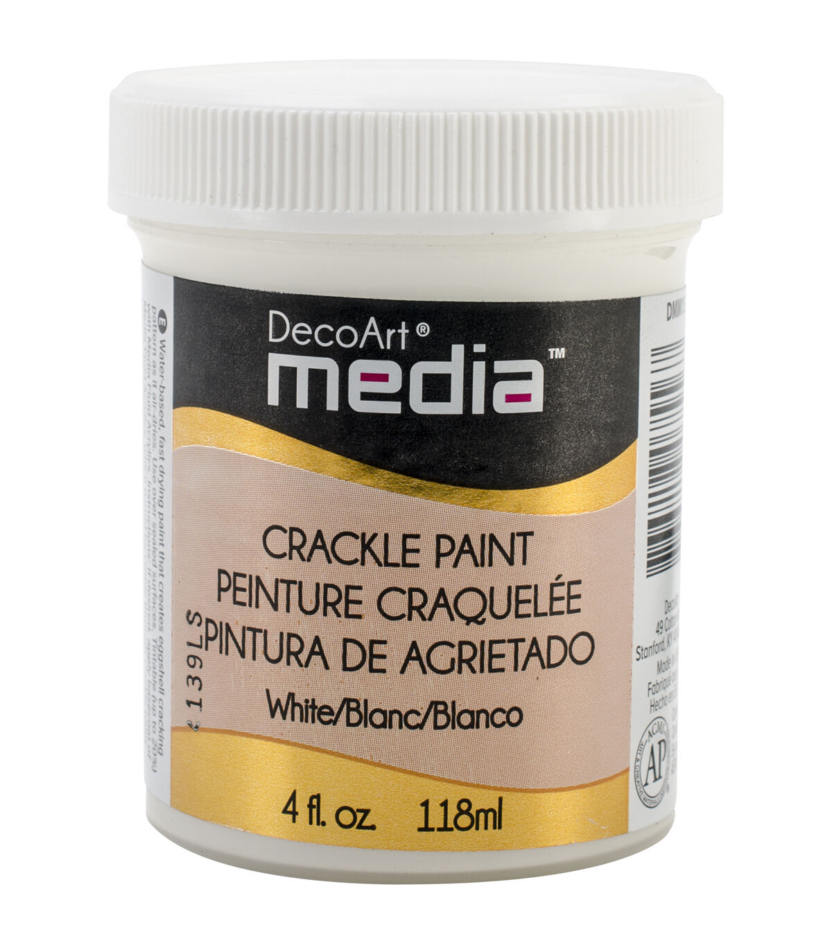 Deco Art-Media Crackle Paint. Fast drying paint that creates an eggshell cracking pattern as it air dries! Use over sealed surfaces. If desired, apply basecoat of Media Fluid Acrylics (sold separately), which would be visible through crackle paint. This package contains one 4oz jar of white crackle paint. Conforms to ASTM D 4236. Made in USA.