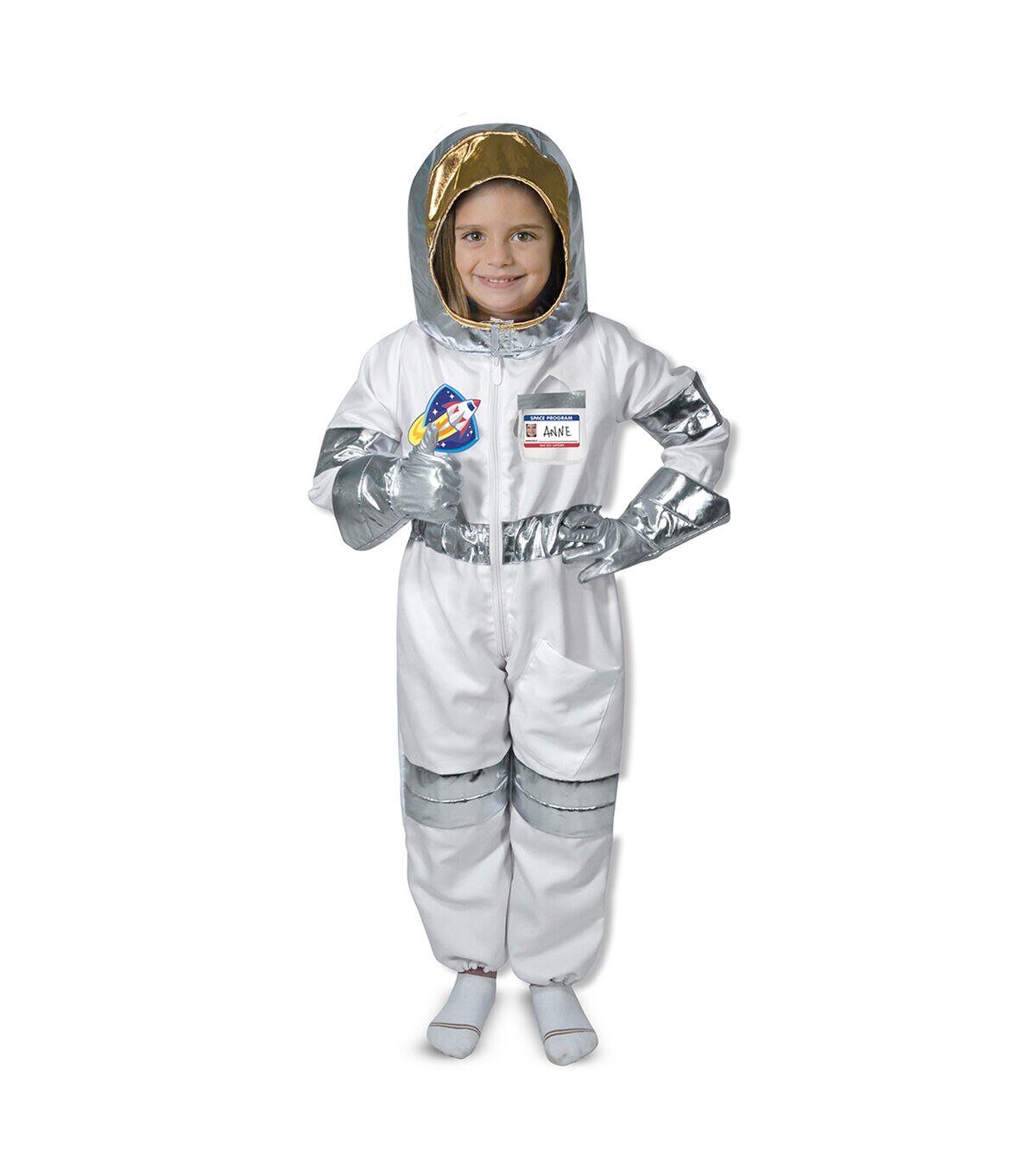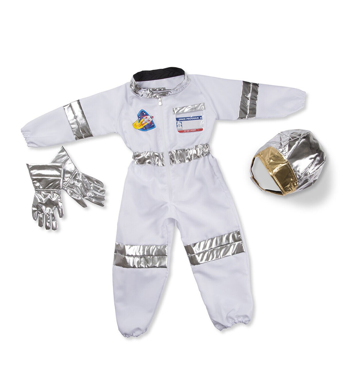 Houston, we have a costume. Kids will be over the moon when they get to step into the jumpsuit, slip on the stretchy silver gloves, and top it all off with the shiny helmet! There's even a reusable nametag that proudly IDs your little space explorer, then wipes clean so another astronaut can have a turn. This durable role play set is suitable for ages 3—6 and ready for any mission, whether it's piloting an imaginary rocket, exploring the distant galaxies at the other end of the house, or just striding dramatically toward your spaceship. Made of sturdy materials and built to last, the entire set is machine washable too!