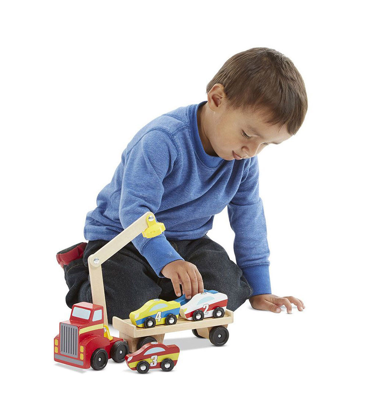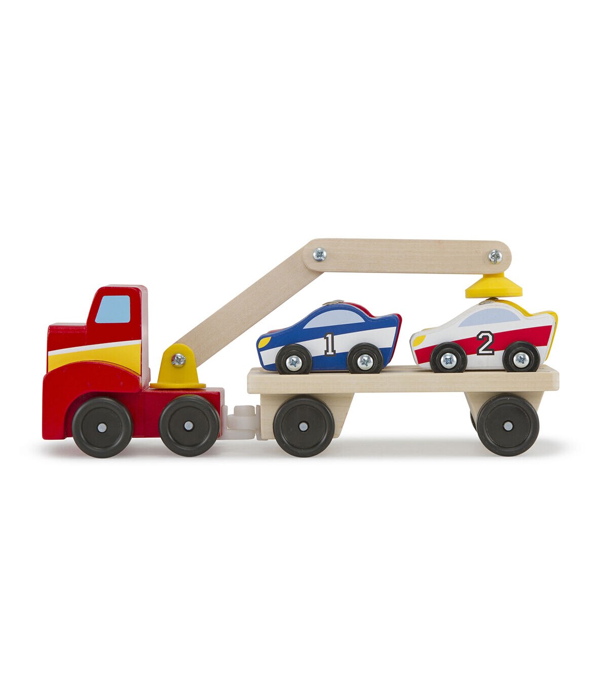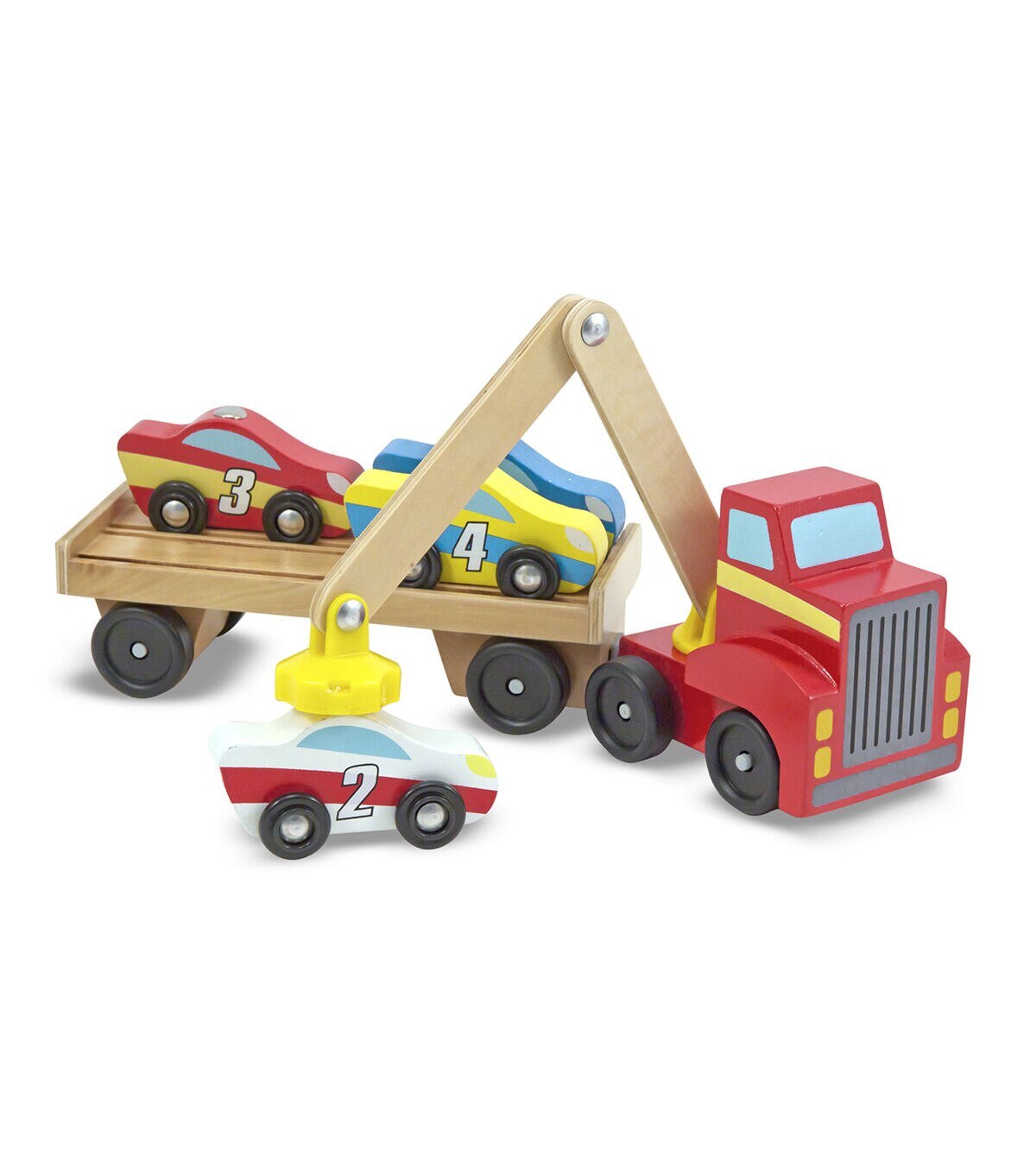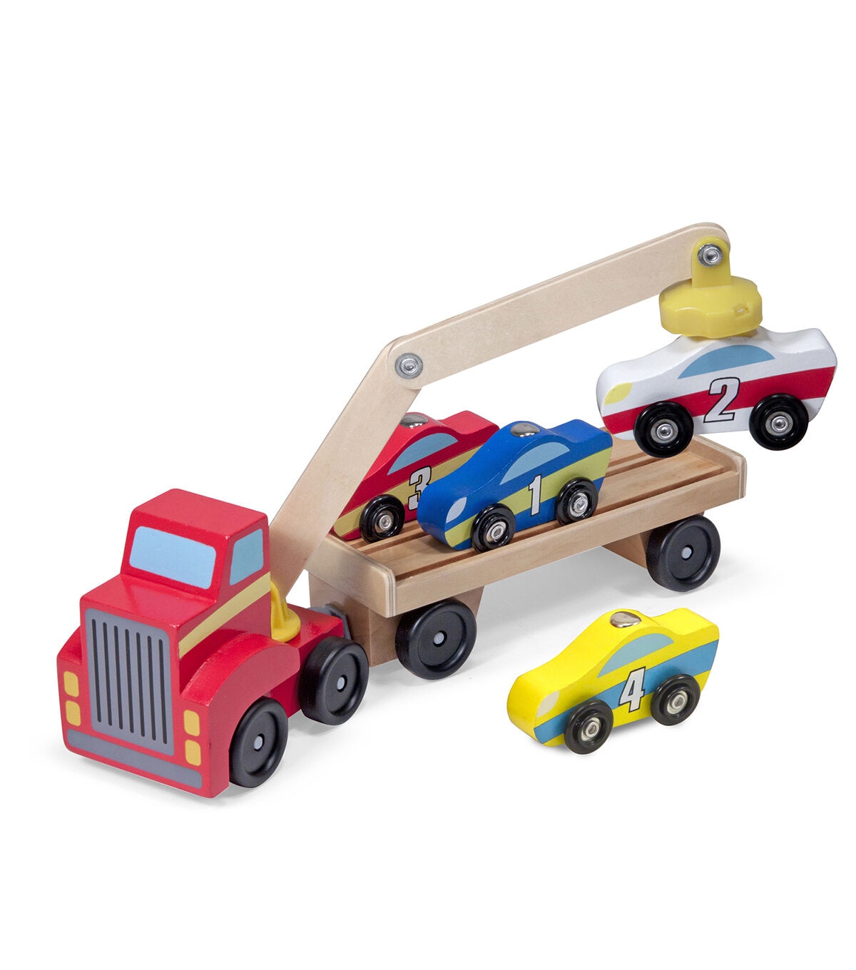 - Includes red truck with magnetic arm, car-carrier trailer, and 4 magnetic wooden cars