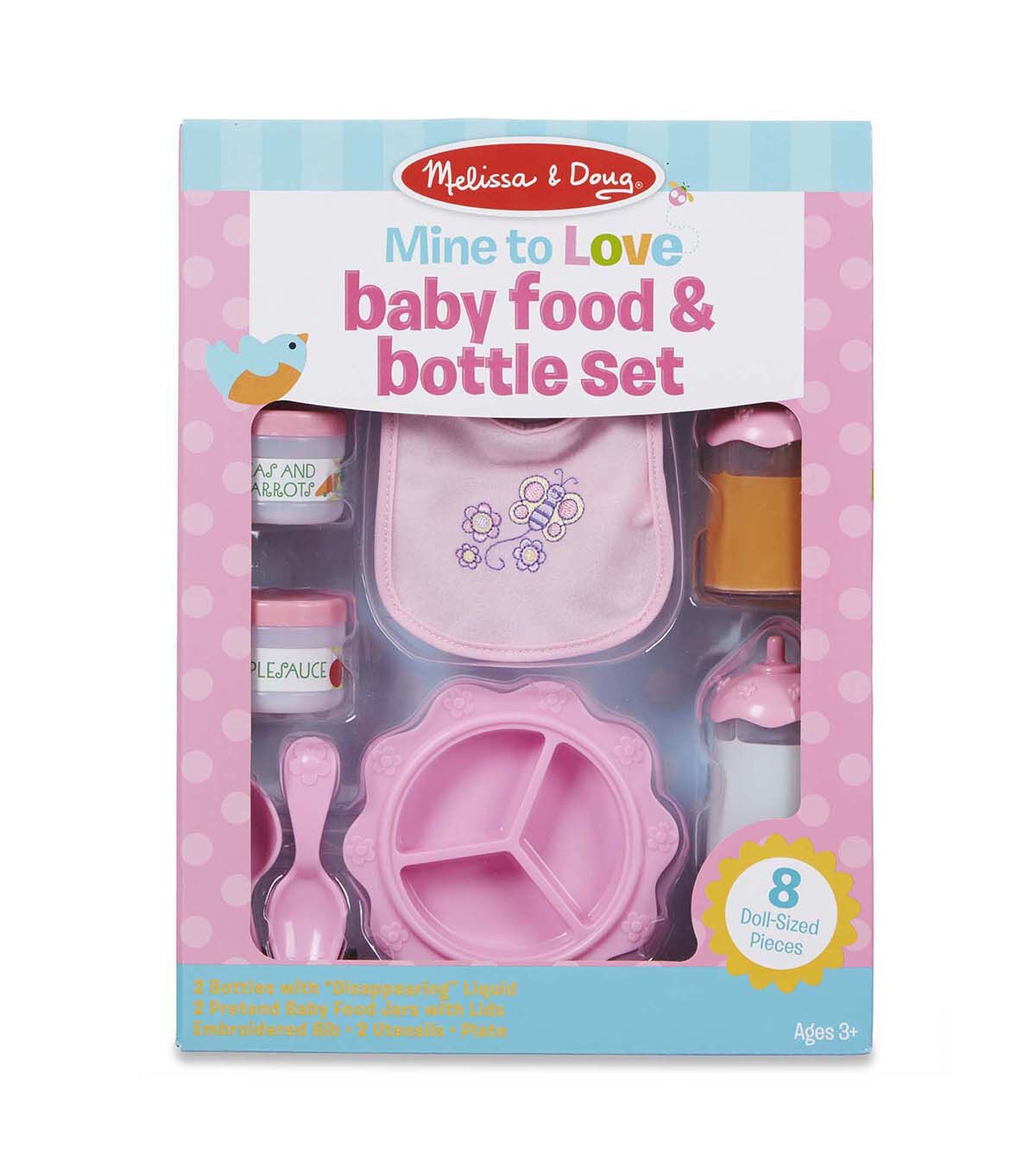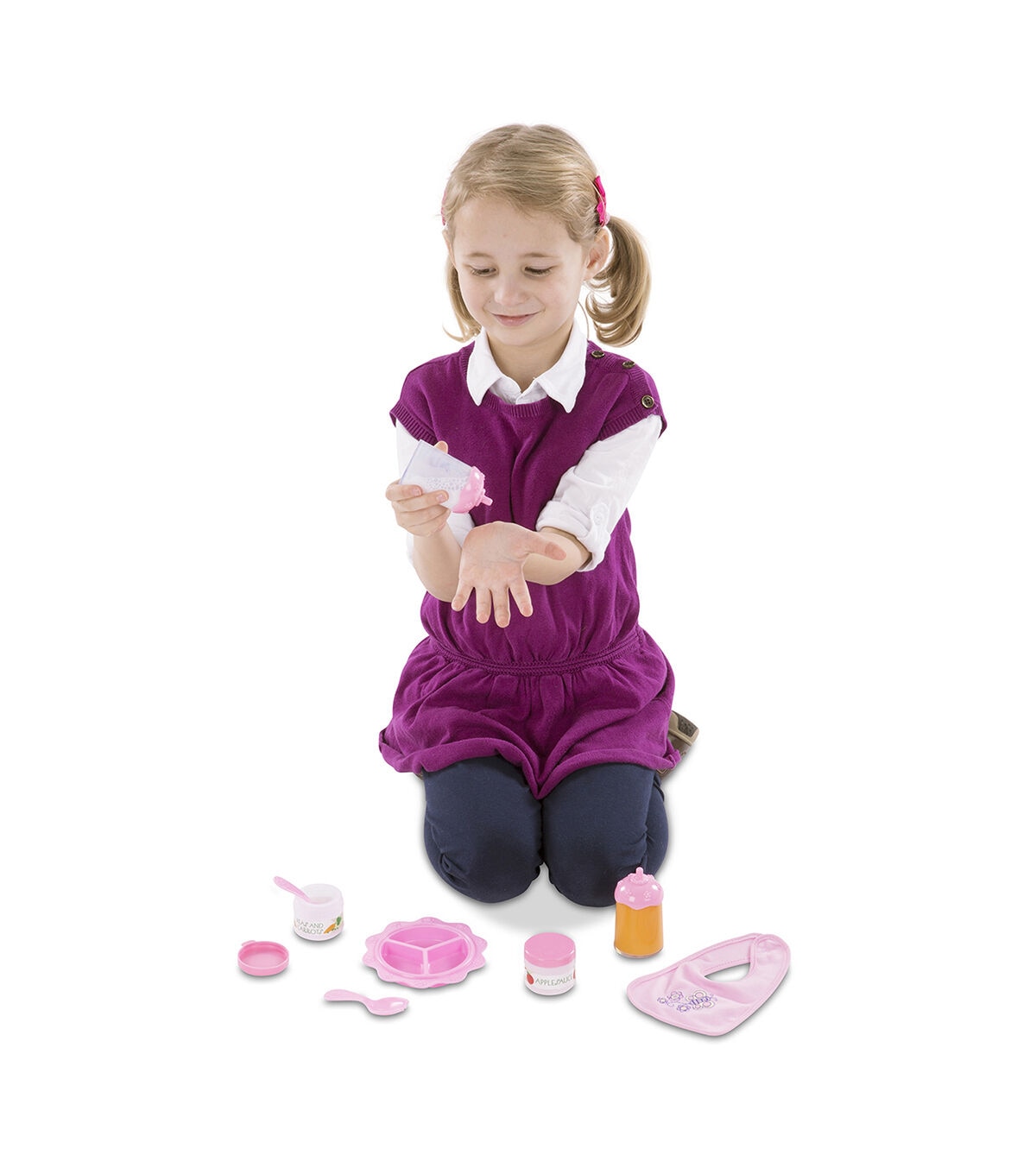 Every mommy knows how important it is to feed a little baby. Now, your little mommy can take care of her baby with this adorable 8-piece set. An easy-close, embroidered bib, keeps baby clean during mealtime which is organized with a divided dish, fork, spoon and yummy "applesauce" and "peas and carrots" for the baby. Disappearing "orange juice" and "milk" bottles add nutrition and fun! Ages 3+