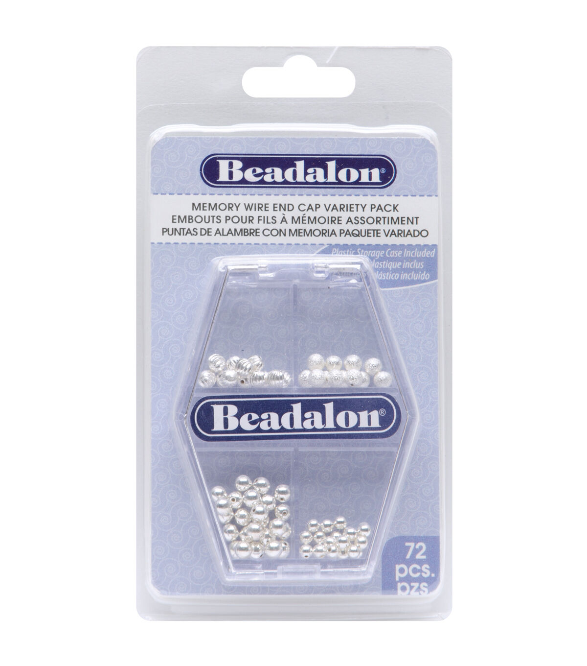 BEADALON-Memory Wire End Cap Variety Pack. This package contains 72 assorted end caps for use with memory wire jewelry designs. Included are four different styles all housed in a handy 2-3/4x2 inch clear plastic storage case. Color: Silver Plated. Imported.