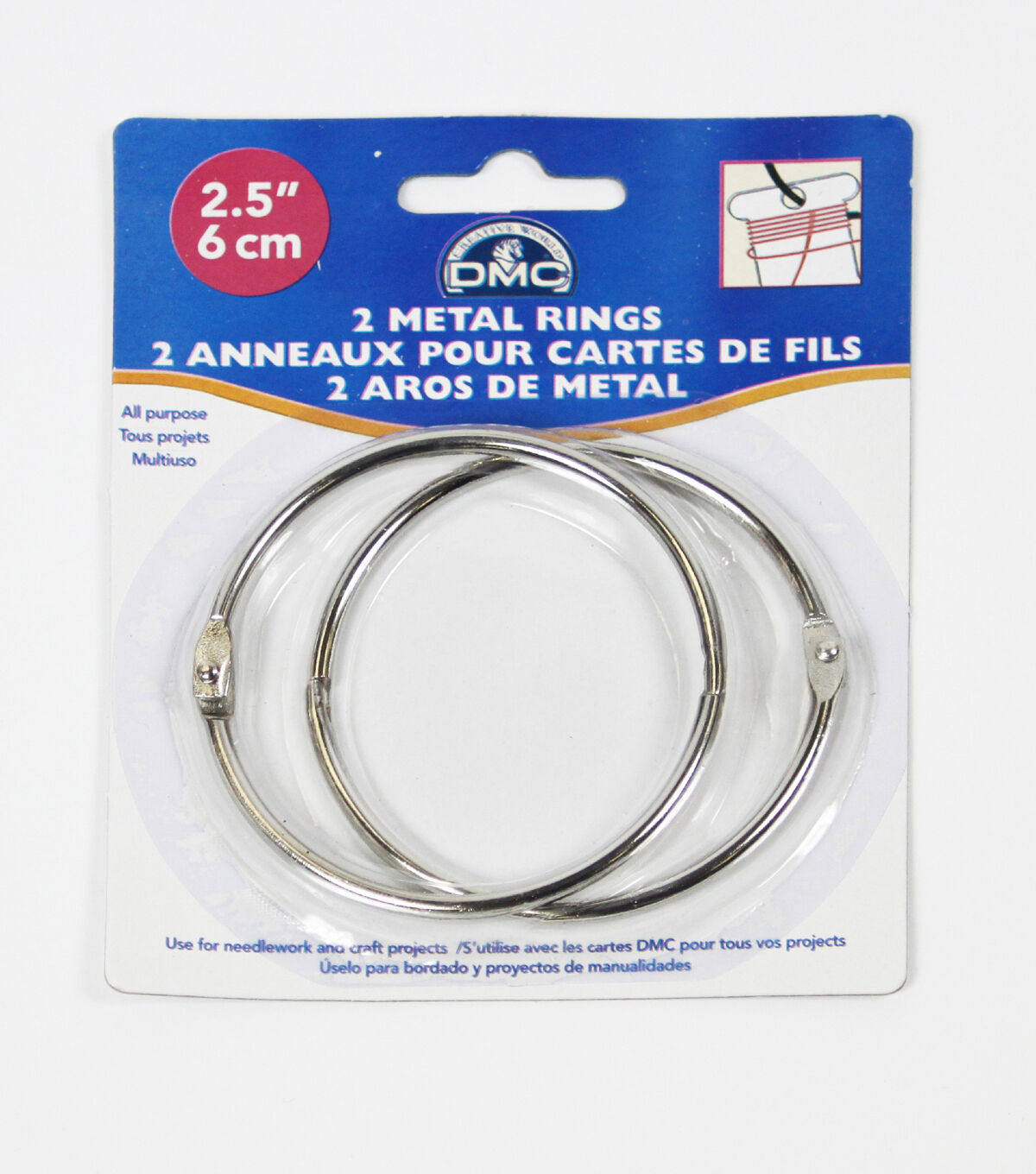 DMC-Metal Rings. Metal craft rings are great to use with organizing threads and bobbins. They can sort and store other craft materials or are a good base for creative craft activities. This package contains two 2-1/2 inch metal rings. Imported.