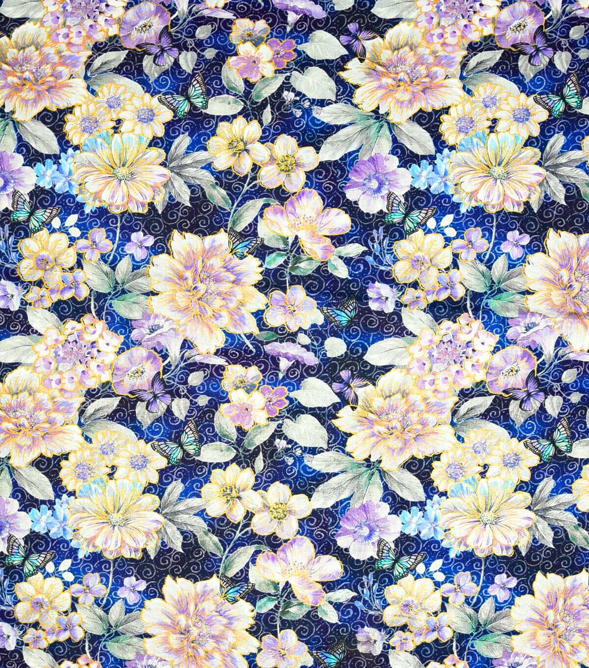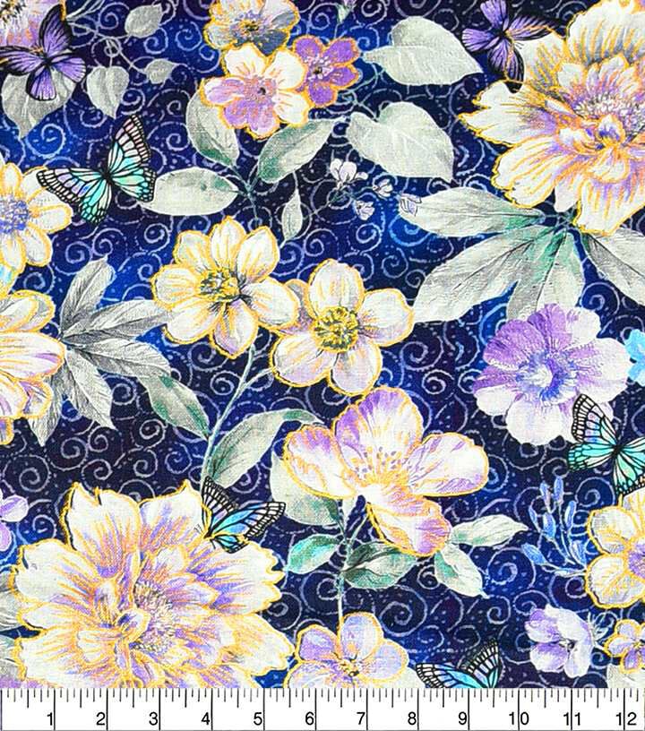 Experience the Beauty of Metallic Dream World Floral on Blue Butterfly Premium Cotton Fabric
